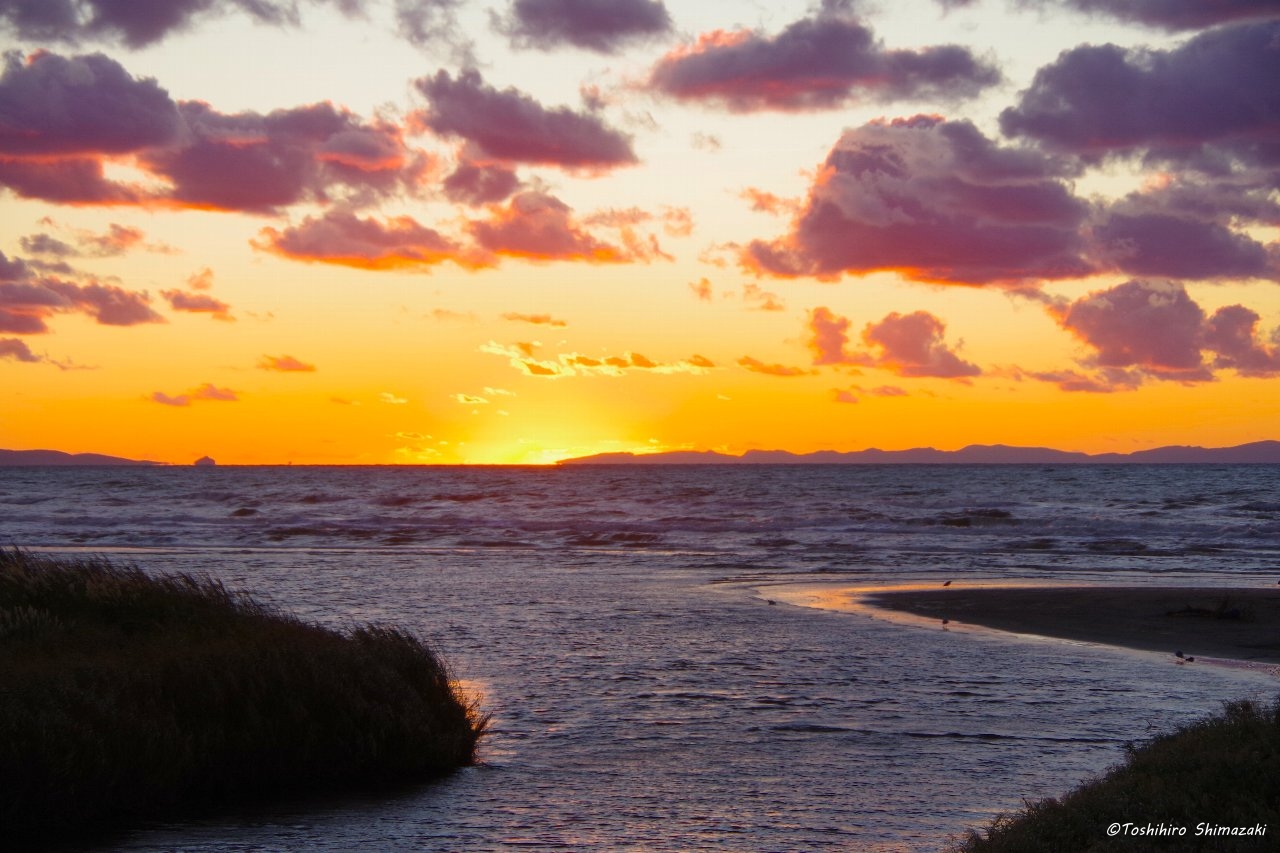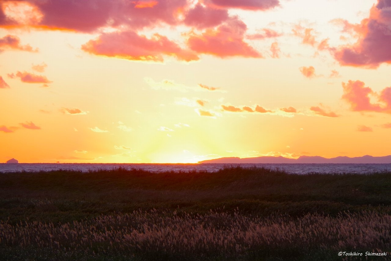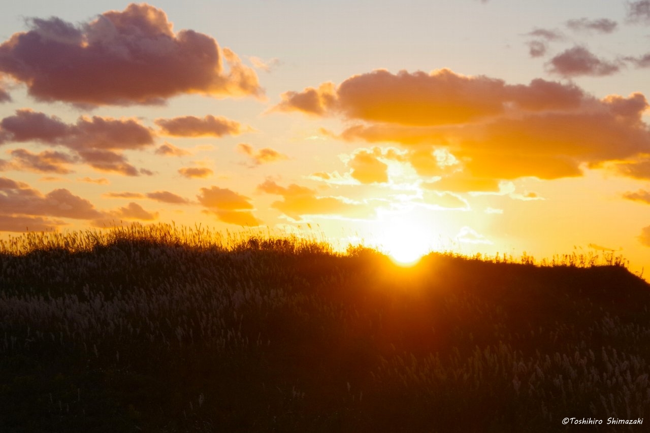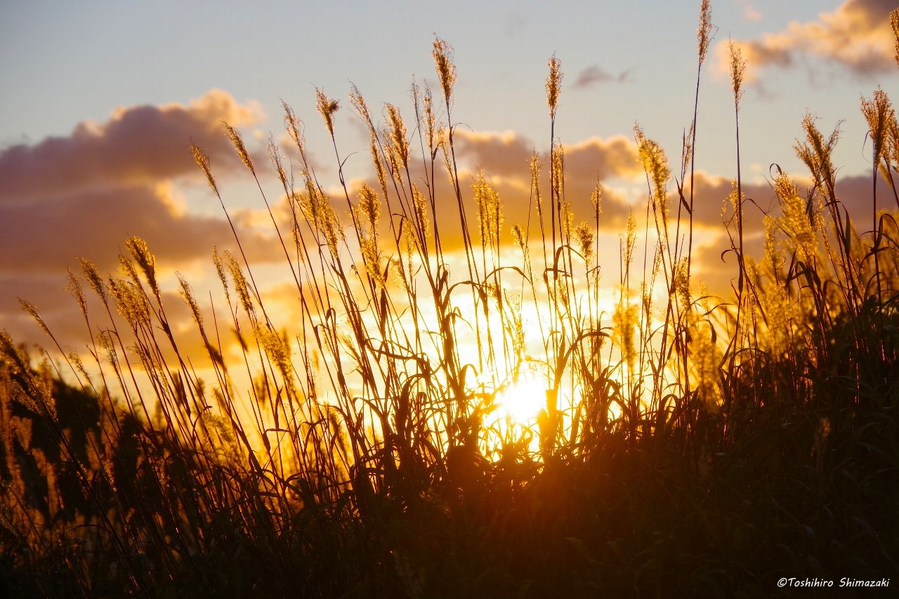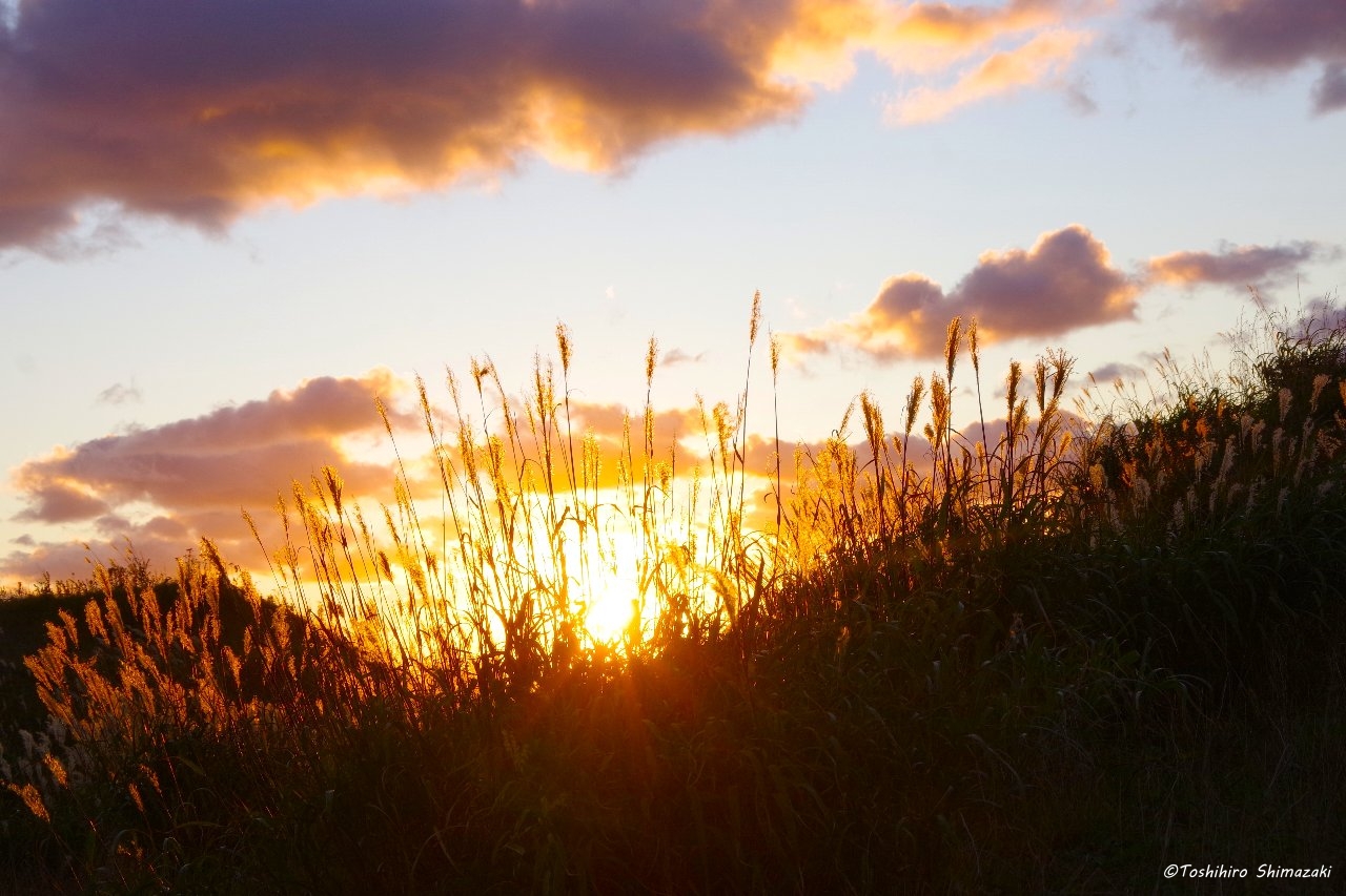 勇知川河口付近ではススキの穂が茜色の光に照らされて美しい景色が広がっていました。