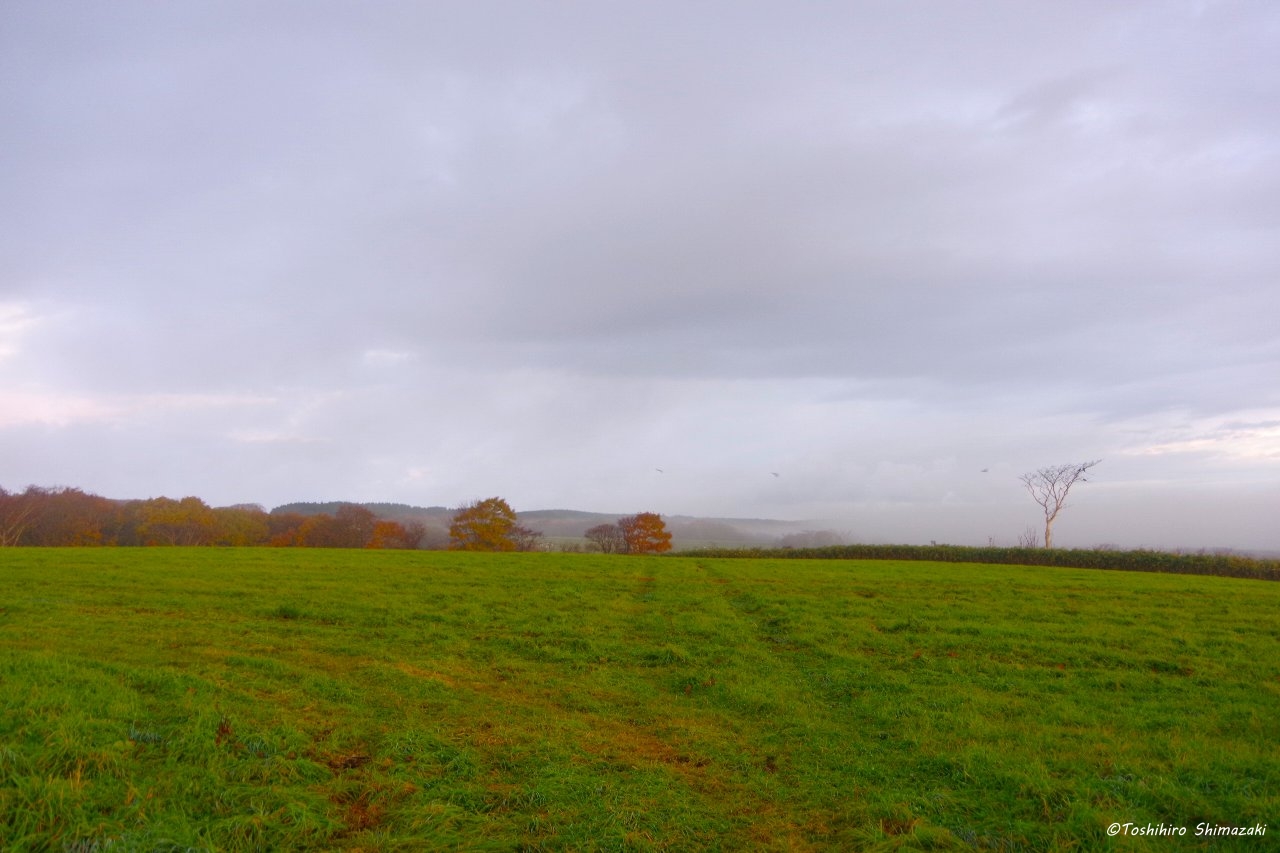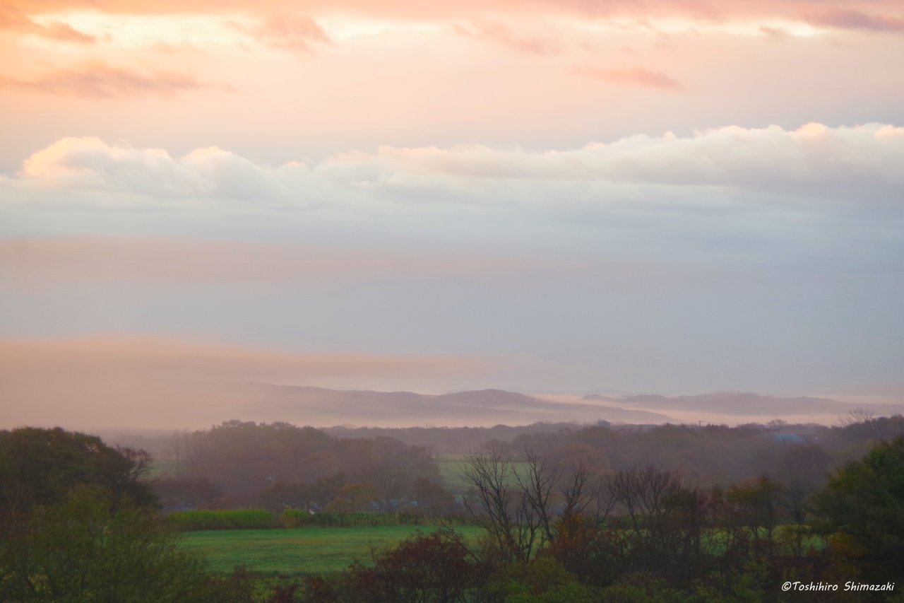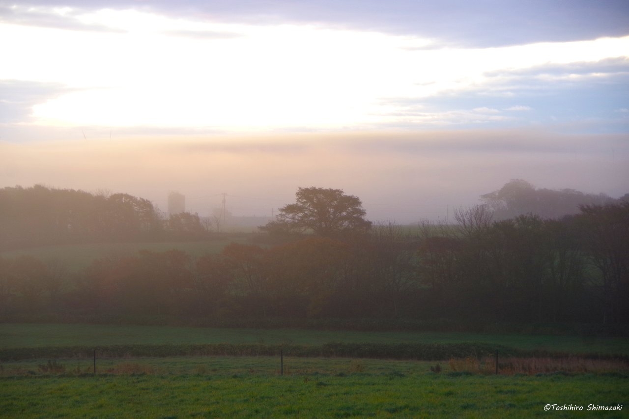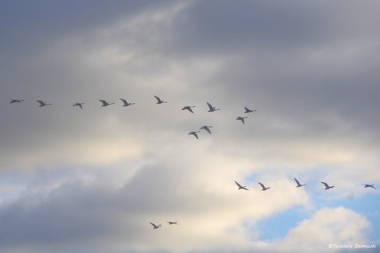 陽が昇り、徐々に明るくなって霧が薄れ始めると、遠くからハクチョウの声が近付いてきました。