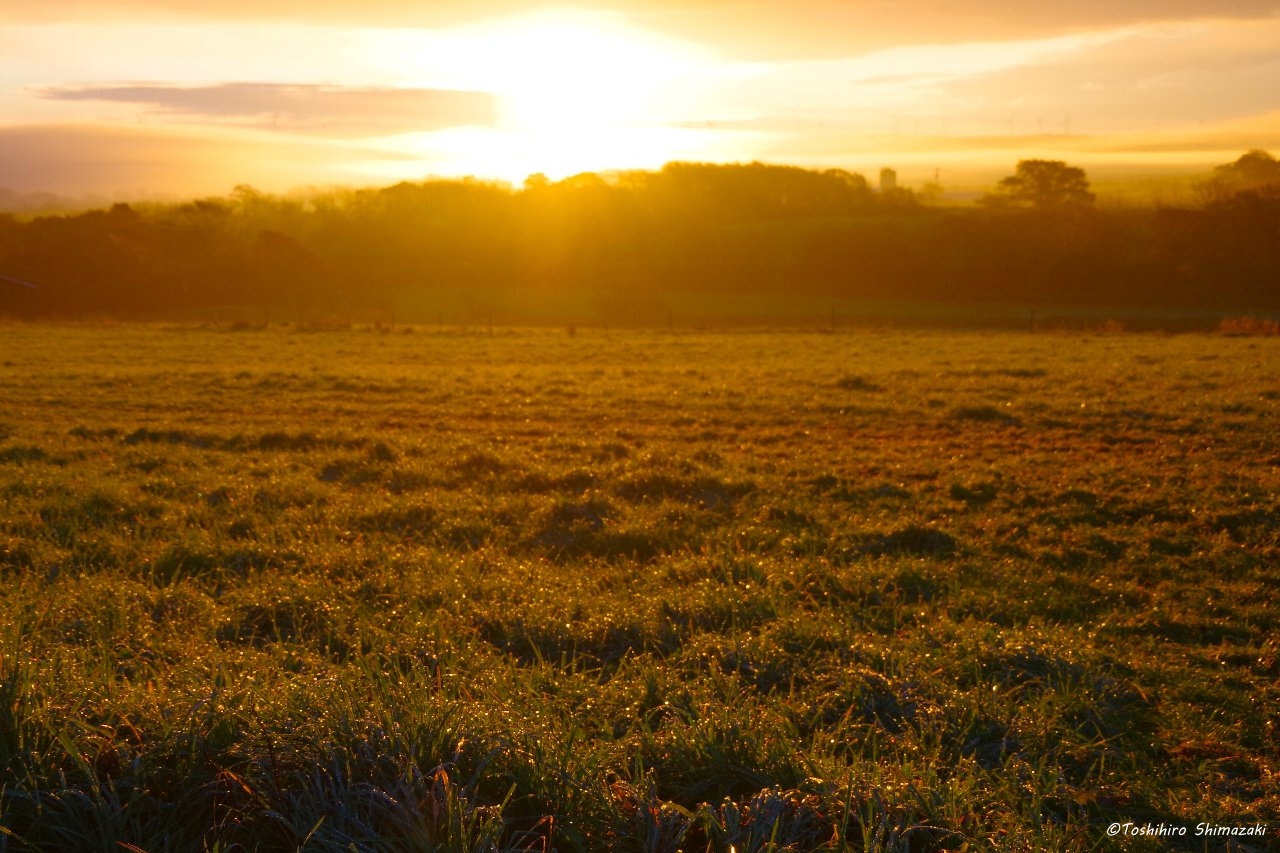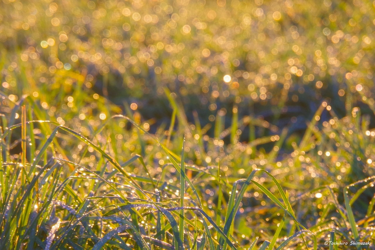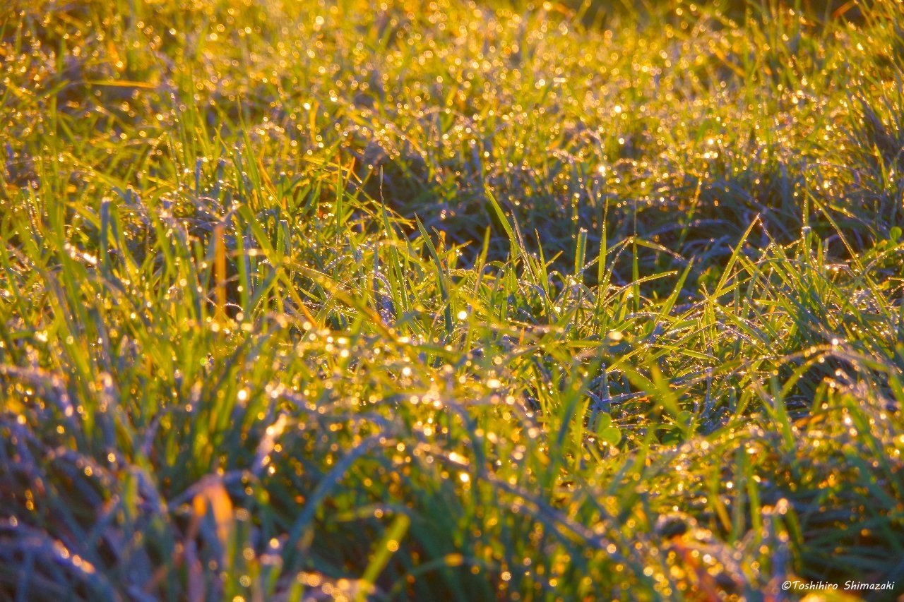 辺り一面の草には霜がおりていましたが、太陽が昇ると光が当たったところから霜はとけて雫に変わります。