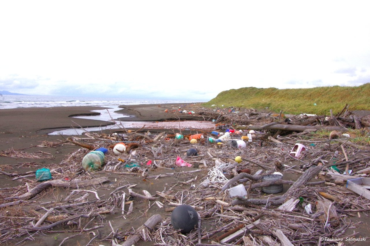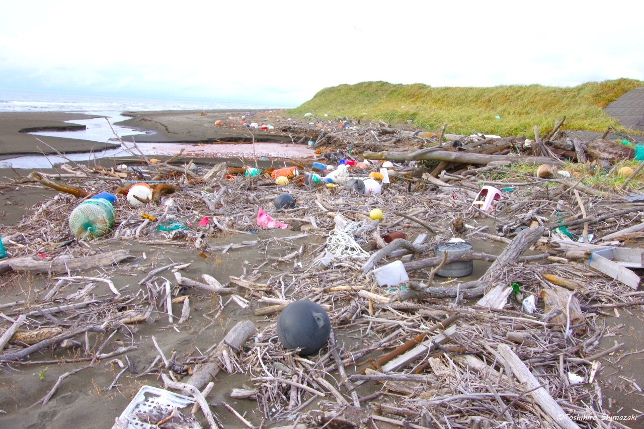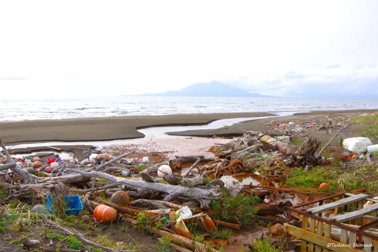 ここは夕陽が美しい稚咲内海岸です。海側はとても綺麗な景色なのですが、反対側の砂浜を見ると大量の漂着ゴミで埋め尽くされています…。残念ながら、これが国立公園内の砂浜の現実です。