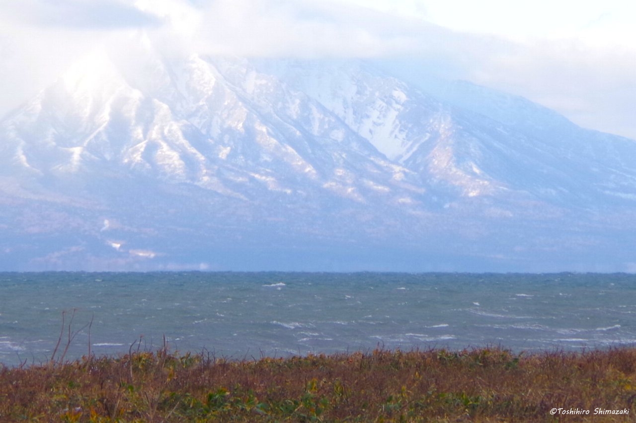 鉛色の日本海は冬らしく白波が立ち、雲の下に見えている利尻島はいよいよ麓の方まで白くなってきました。