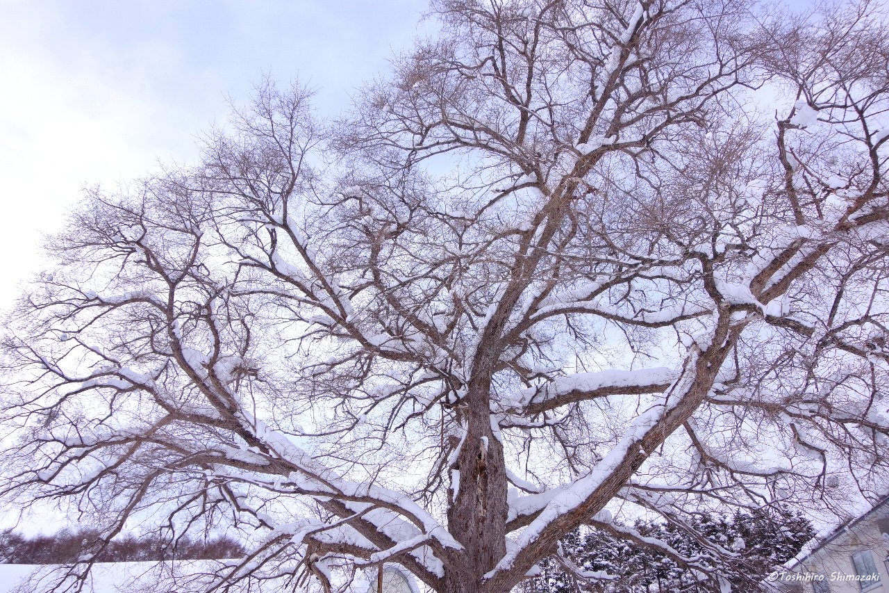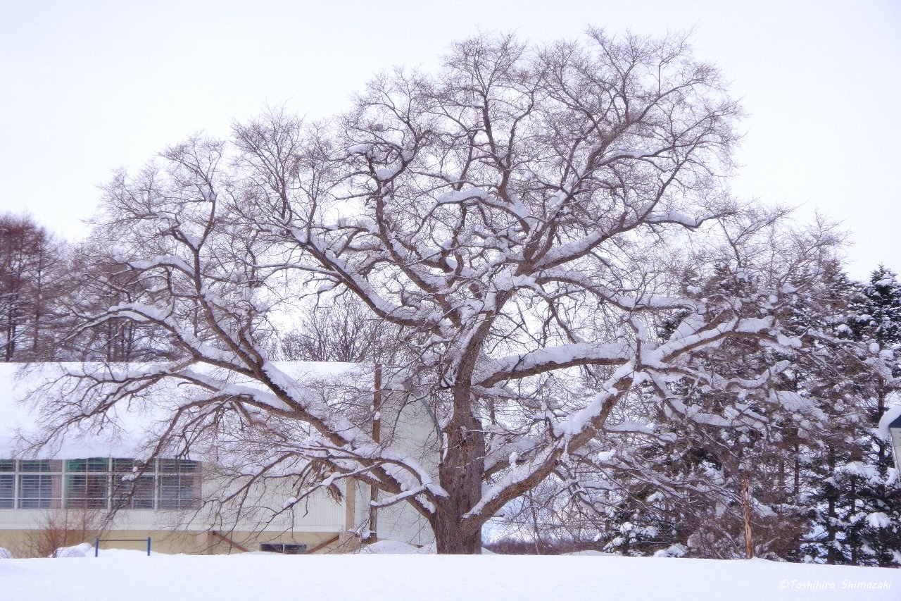 ハイライトの一つは旧温泉小学校(現グループホーム和ごころ)のグラウンドわきに立つハルニレの木。推定樹齢300年、樹高18m、幹回り4mの立派な巨木です。校庭側から眺めると樹形がハート型のようにも見えます。