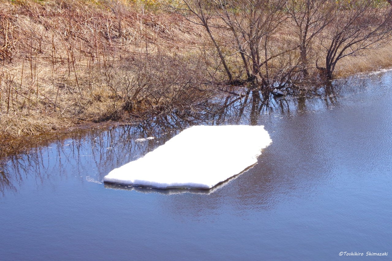 橋の上から眺めると四角い氷がゆっくりと流れ下って行きました。