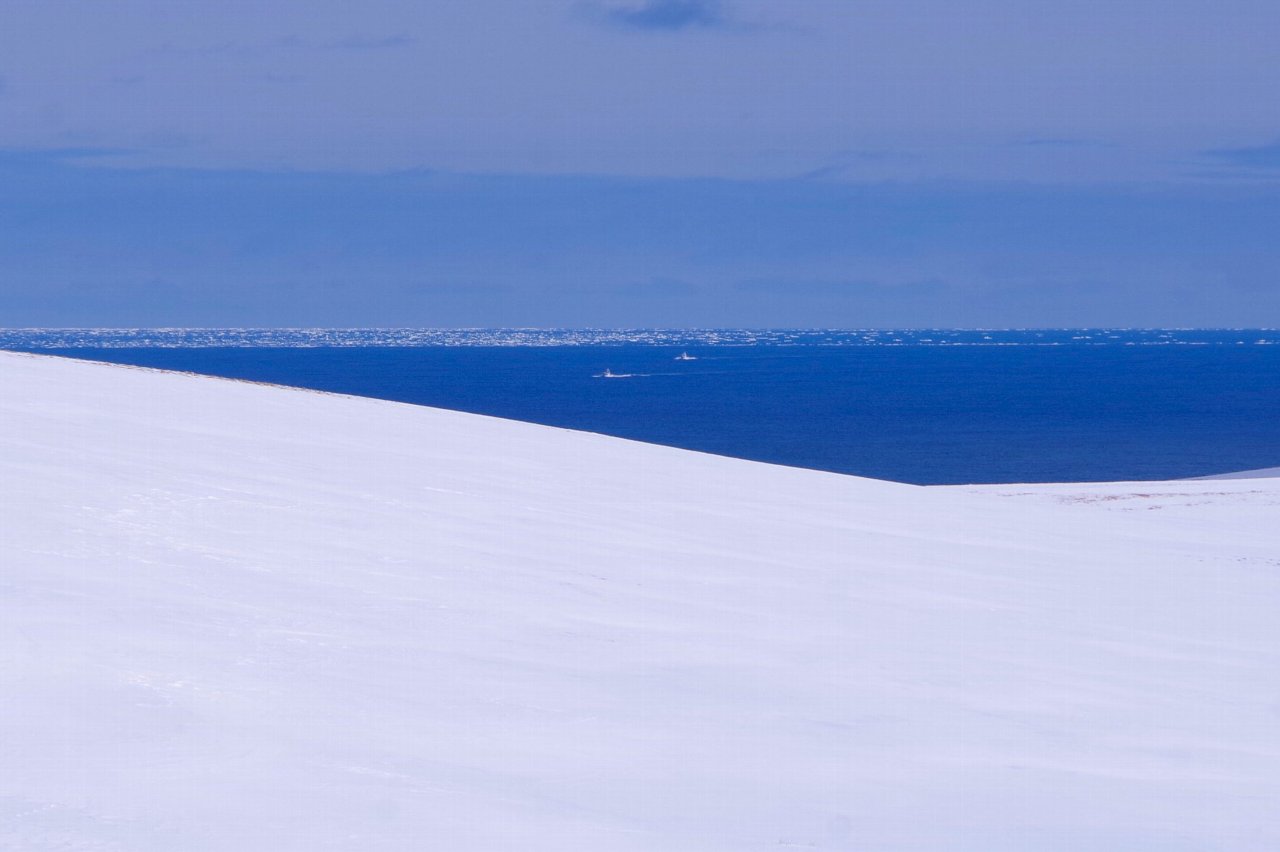 遠くオホーツク海には流氷の白い帯も。雪が積もっていても周氷河地形の独特な形は良く分かります。