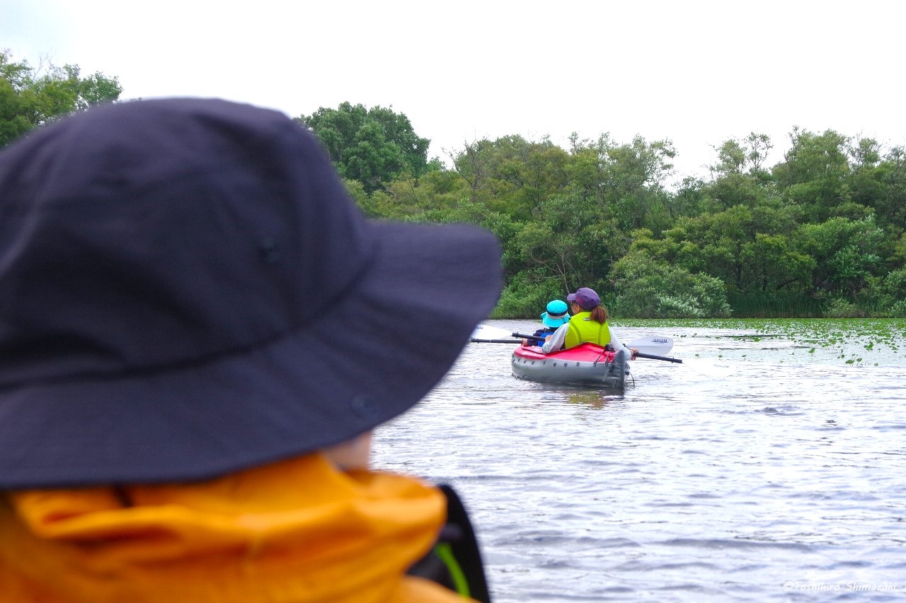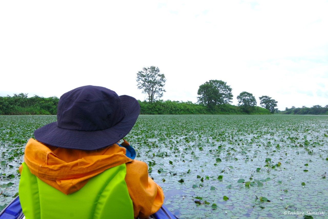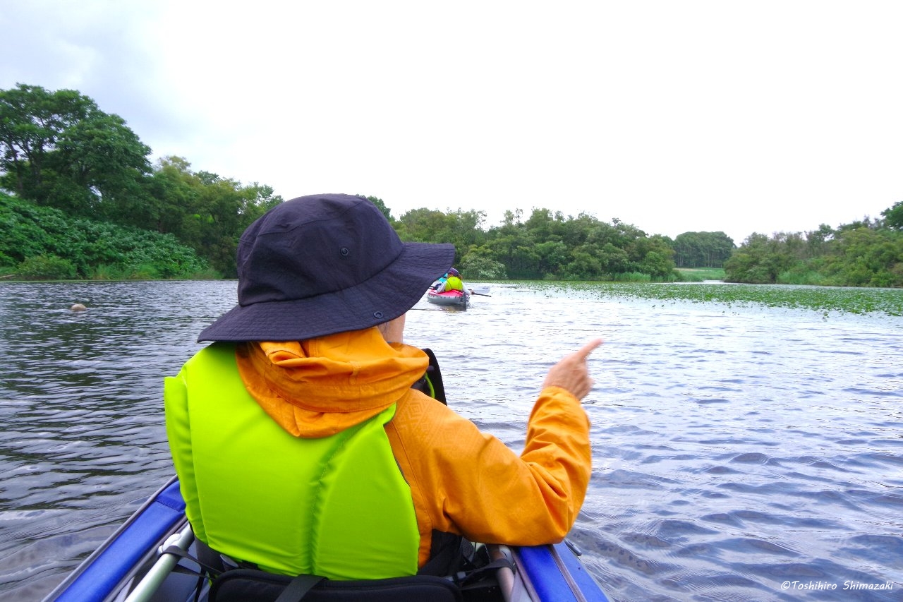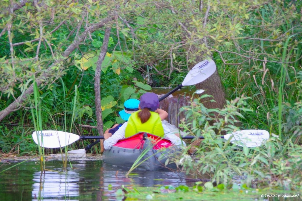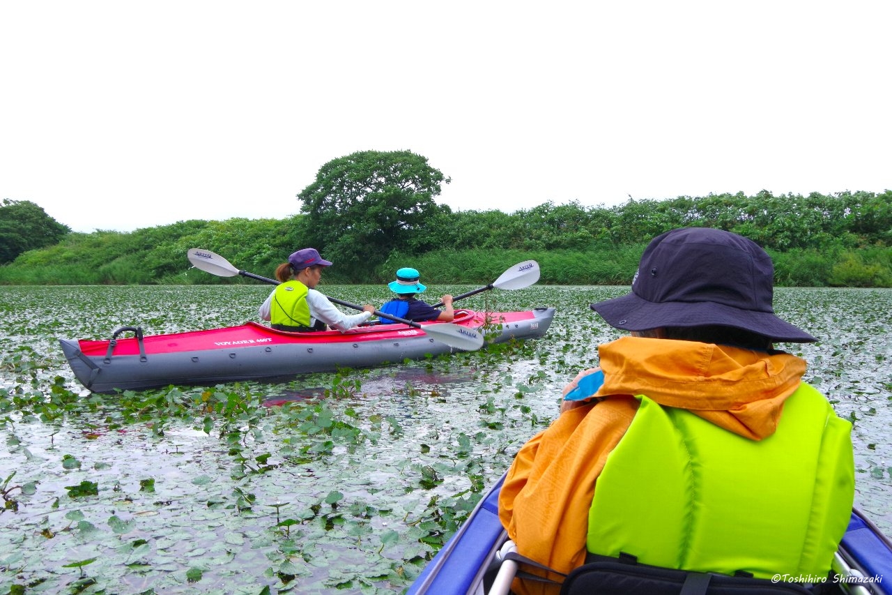 漕がなくても良いように、私と一緒に乗ってもらいました。最初はさすがに緊張気味でしたが、ヒシの花を見たり、鳥を見たりしているうちに少しずつ慣れて、最後は少しだけパドルで漕いでみていただきました。