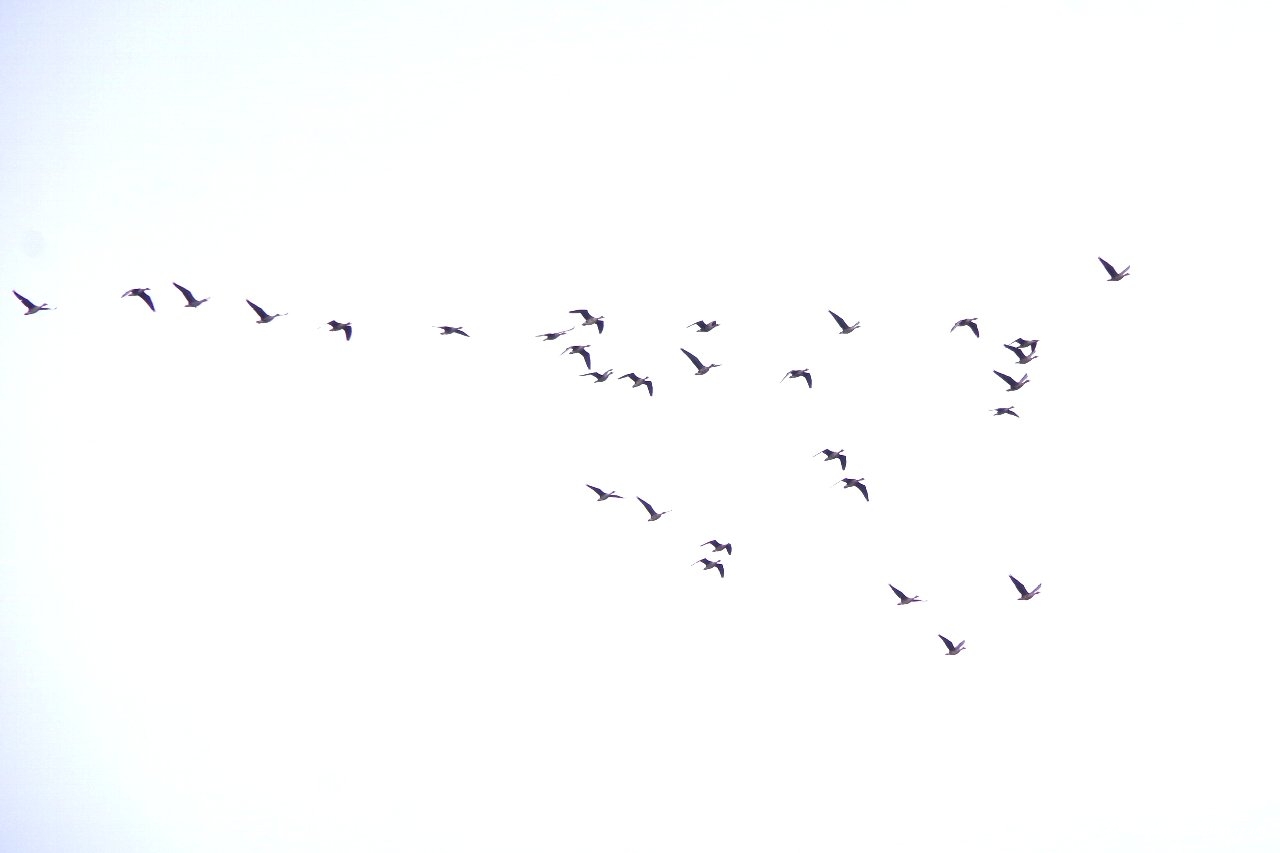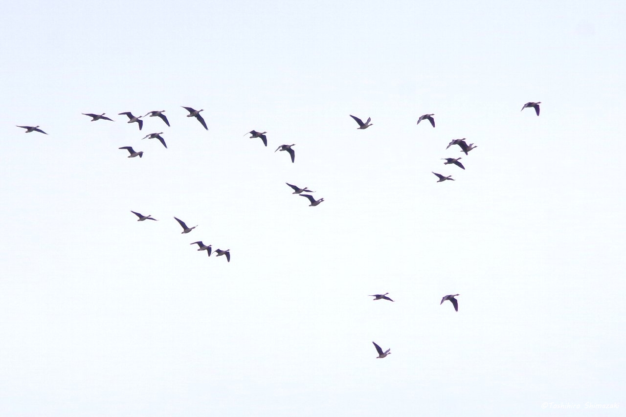 サロベツ湿原の展望デッキで秋色の地平線を眺めていると、オオヒシクイの群れが飛んできてくれました。