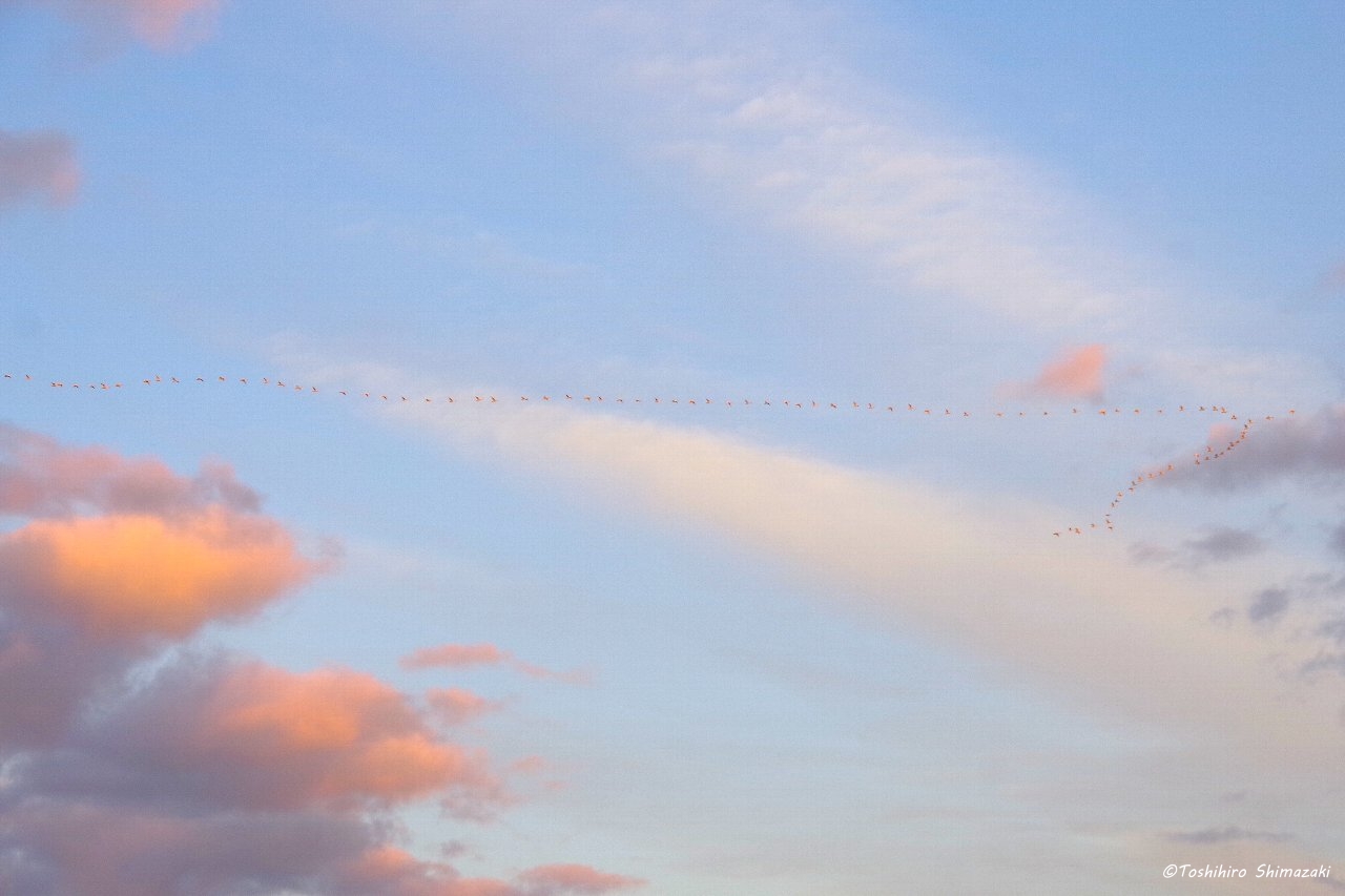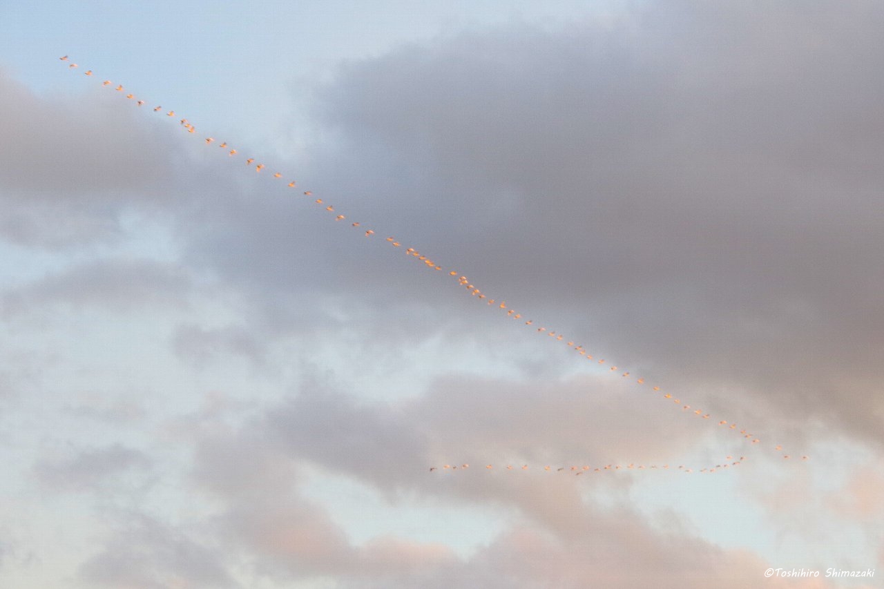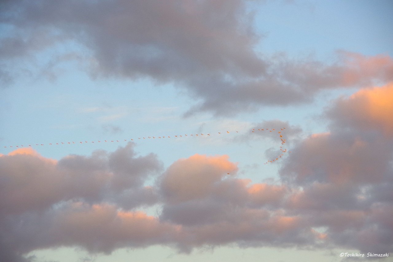 夕陽の色に染まりながら美しいV字編隊で次々とサロベツの空を渡っていきます。
