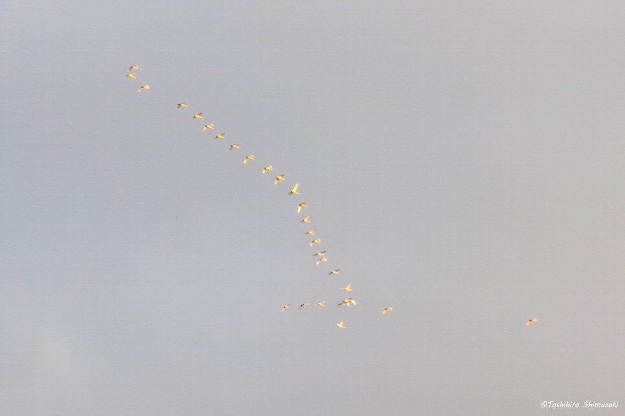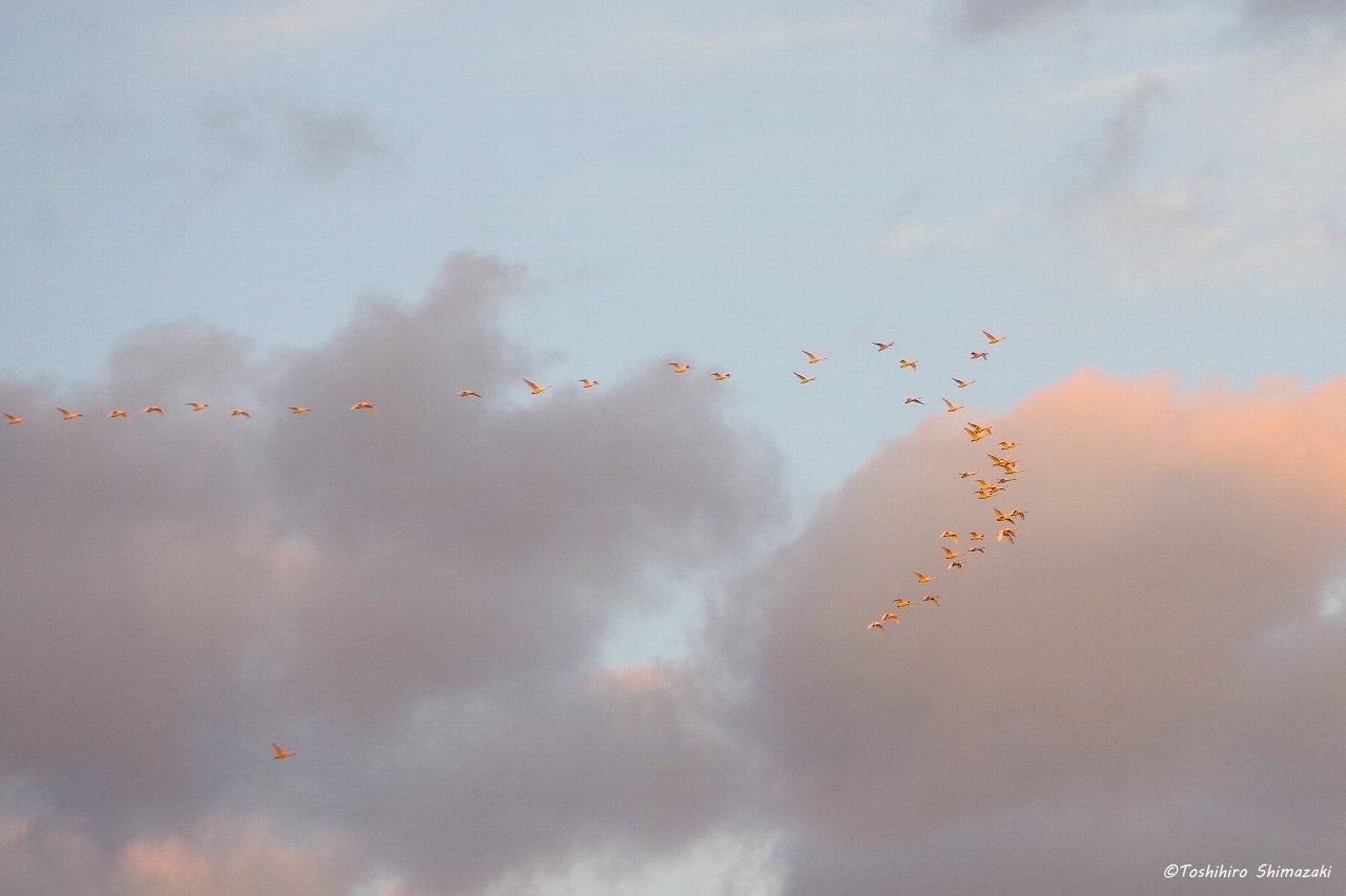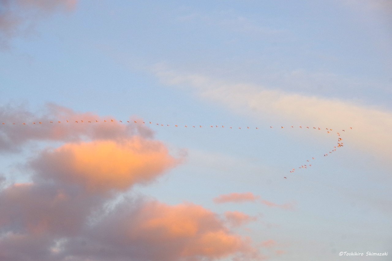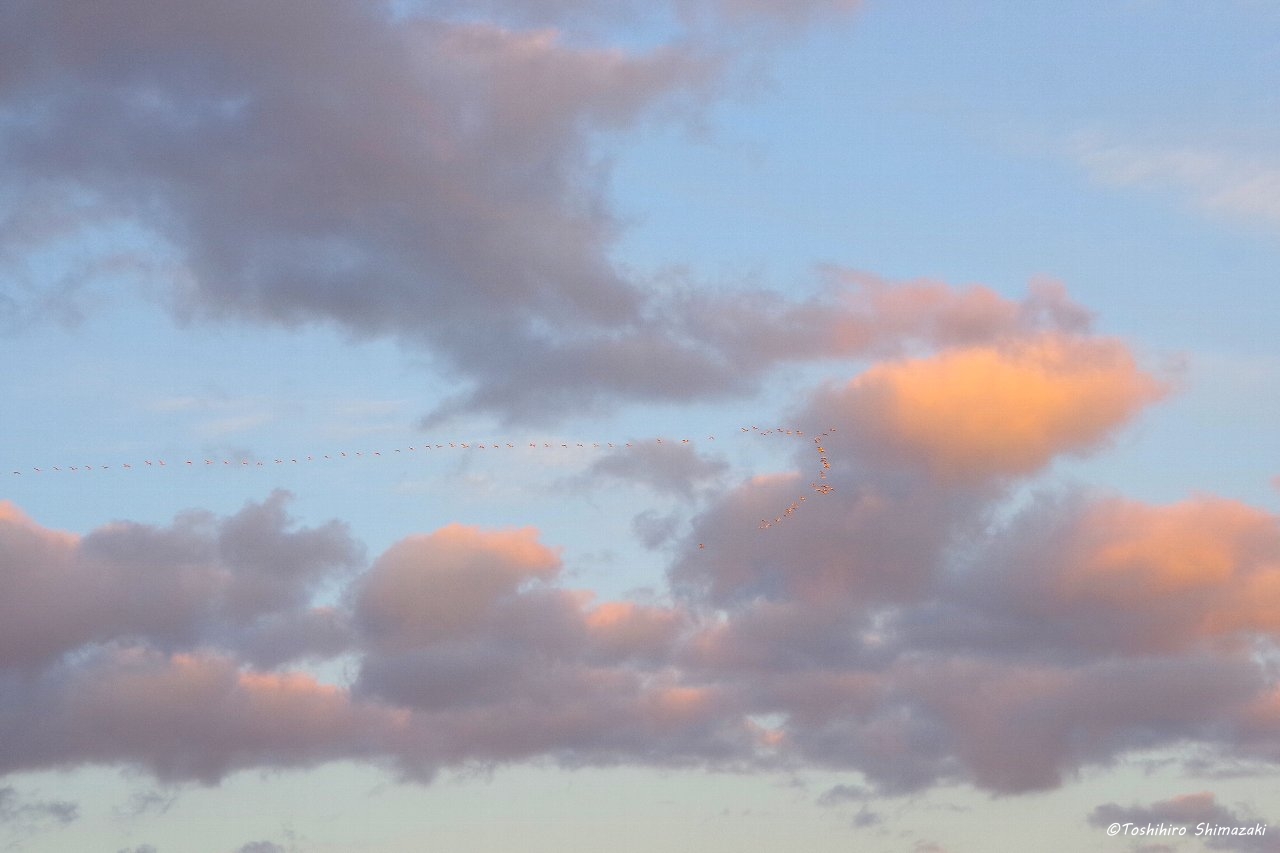 夕陽の色に染まりながら美しいV字編隊で次々とサロベツの空を渡っていきます。