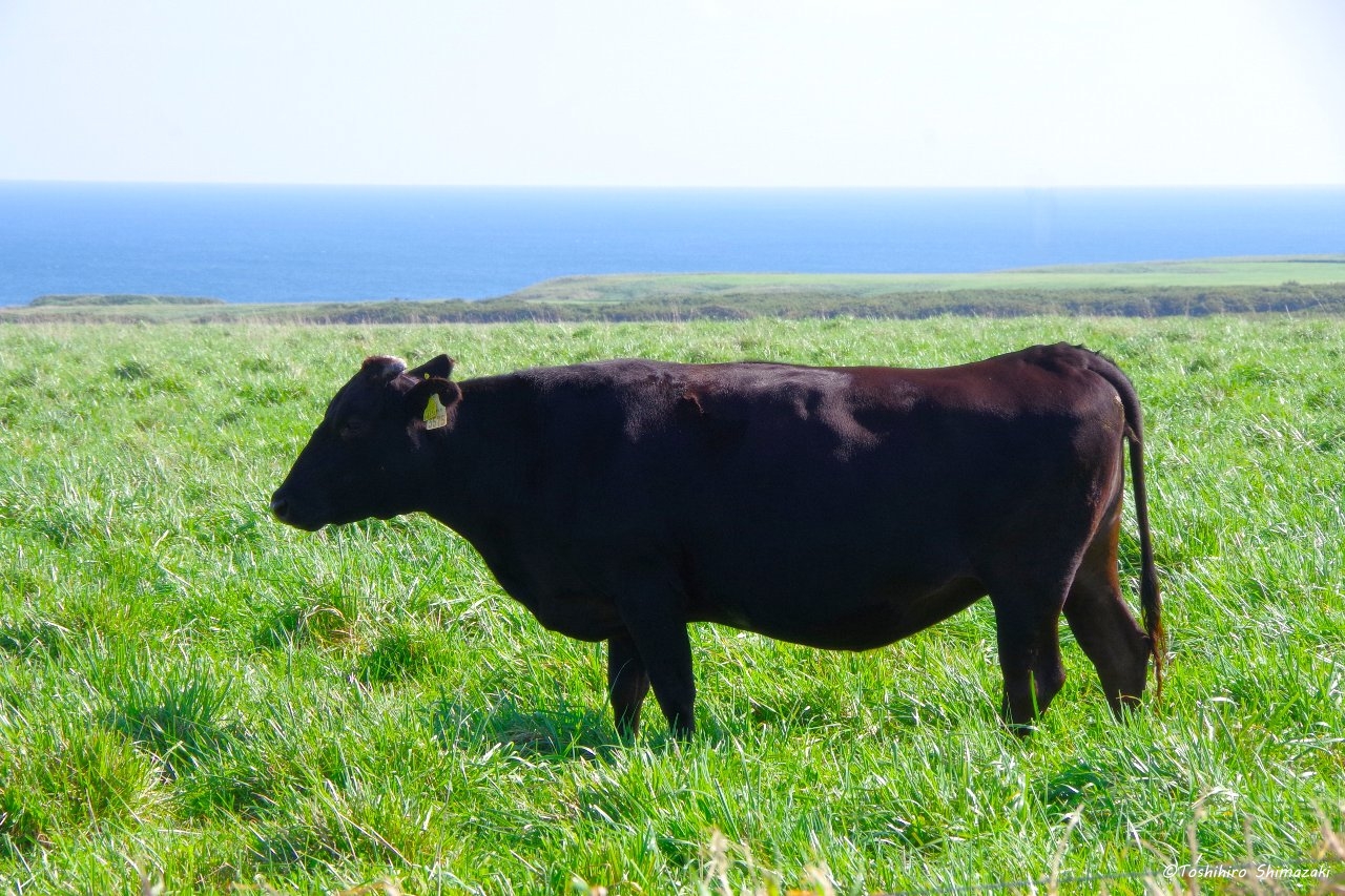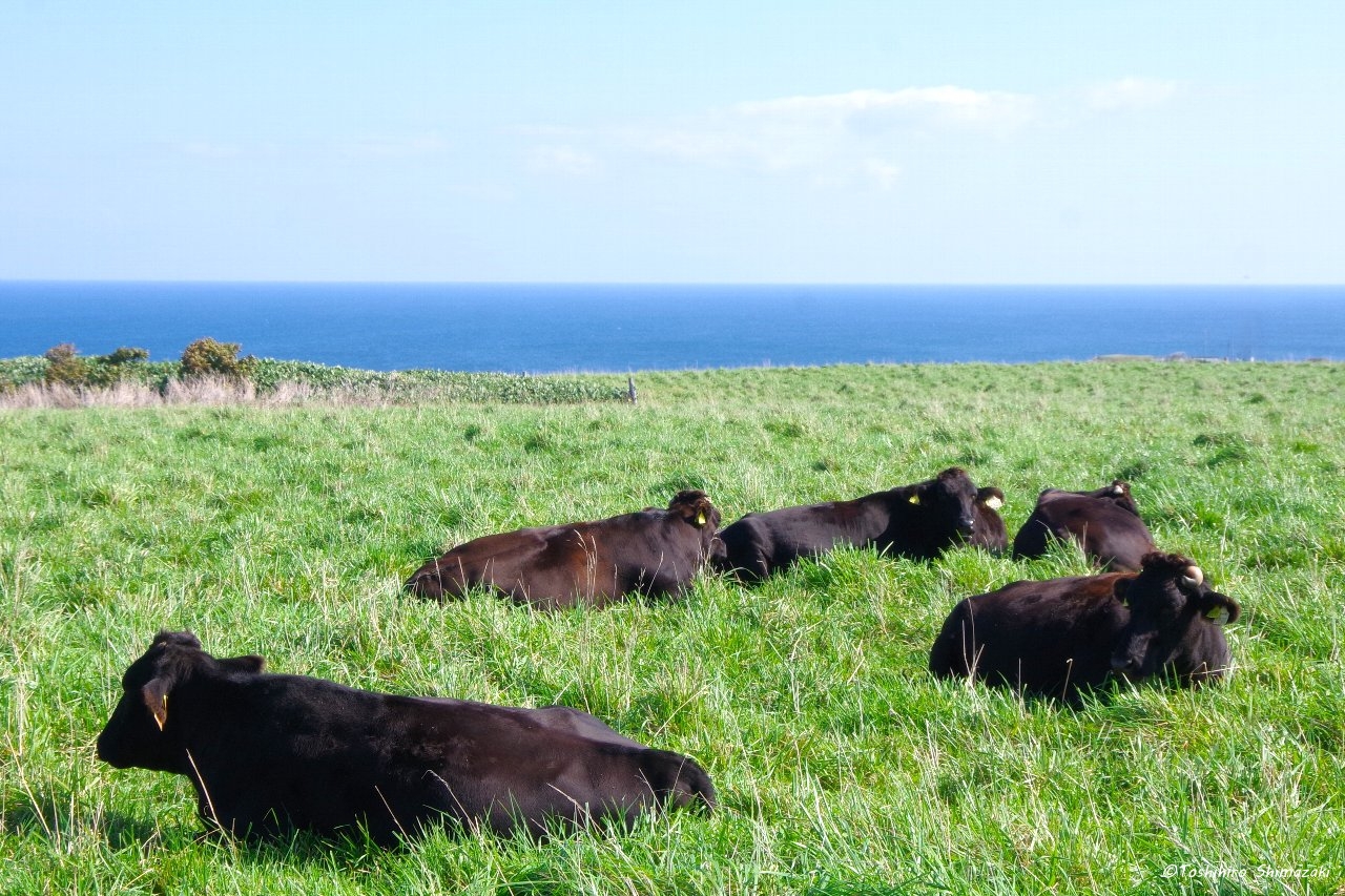 宗谷岬牧場の緑の丘では宗谷黒牛がのんびりと草を食んでいました。