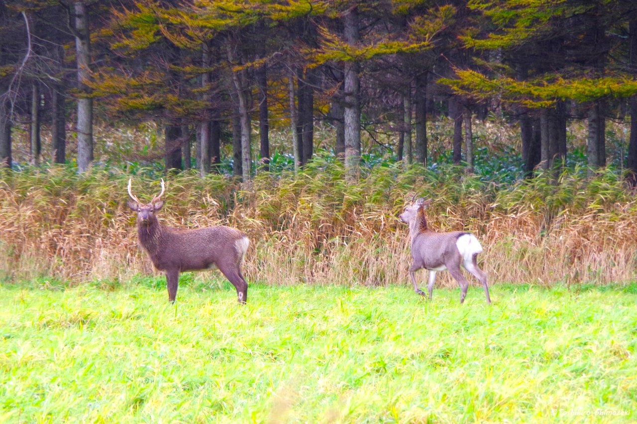 牧草地には、すっかり冬毛になったエゾシカもいました。