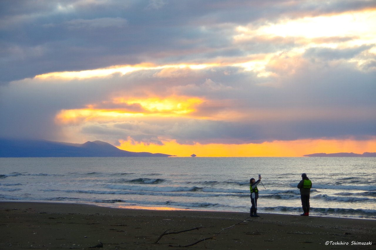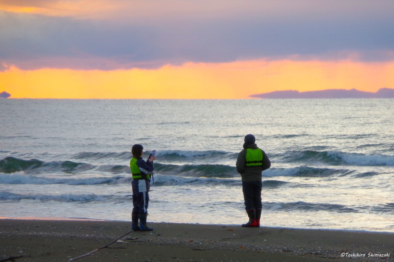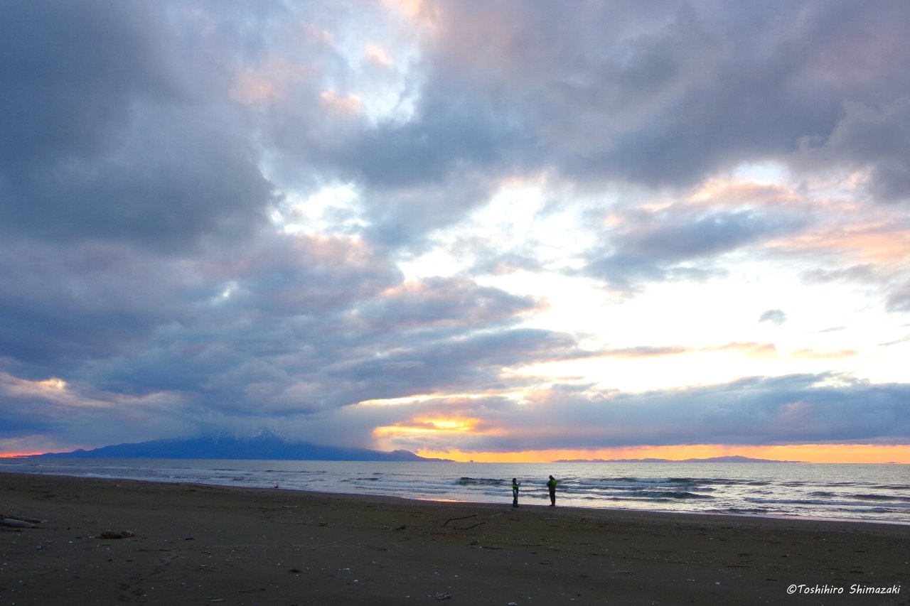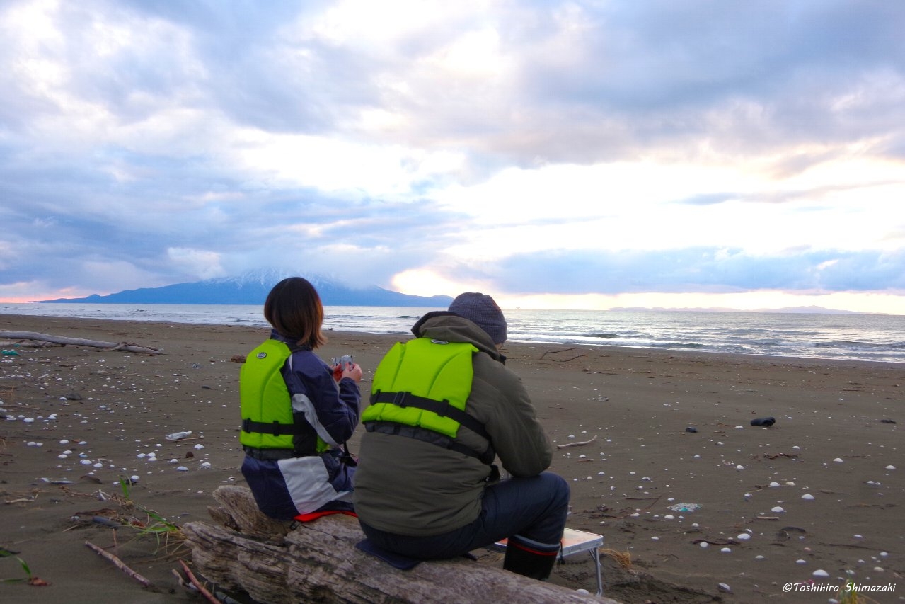 砂浜で流木に座って温かいお飲み物とお貸しをいただいて、昔の稚内のお話なども聞かせていただきました。