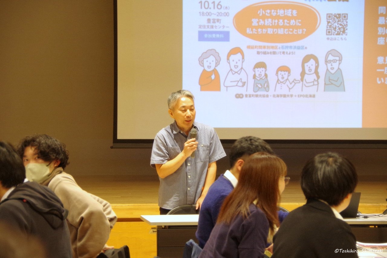 今回は、他地域の先進事例を学ぶ内容で、お隣の幌延町・問寒別地区で活躍さてている「NPO法人みなといかん」さんの活動や、石狩市浜・益地区で活動中の「NPO法人ezorock」さんの事例を聞かせていただき、その後、参加者で印象に残った話や、豊富町でも実現させてみたいことなどについてワークショップで話し合いました。