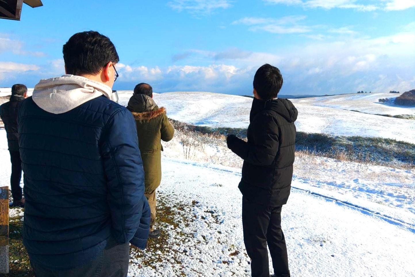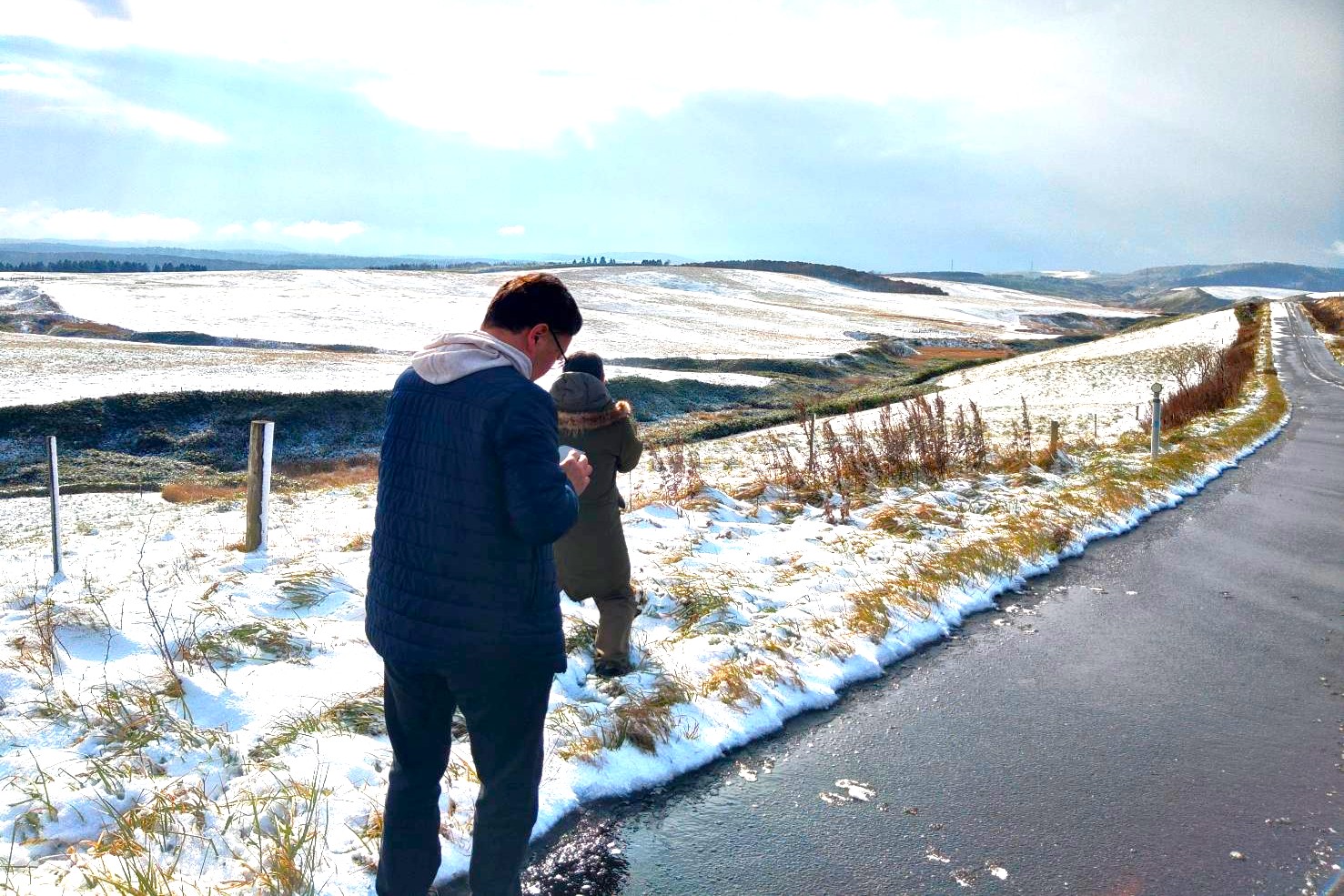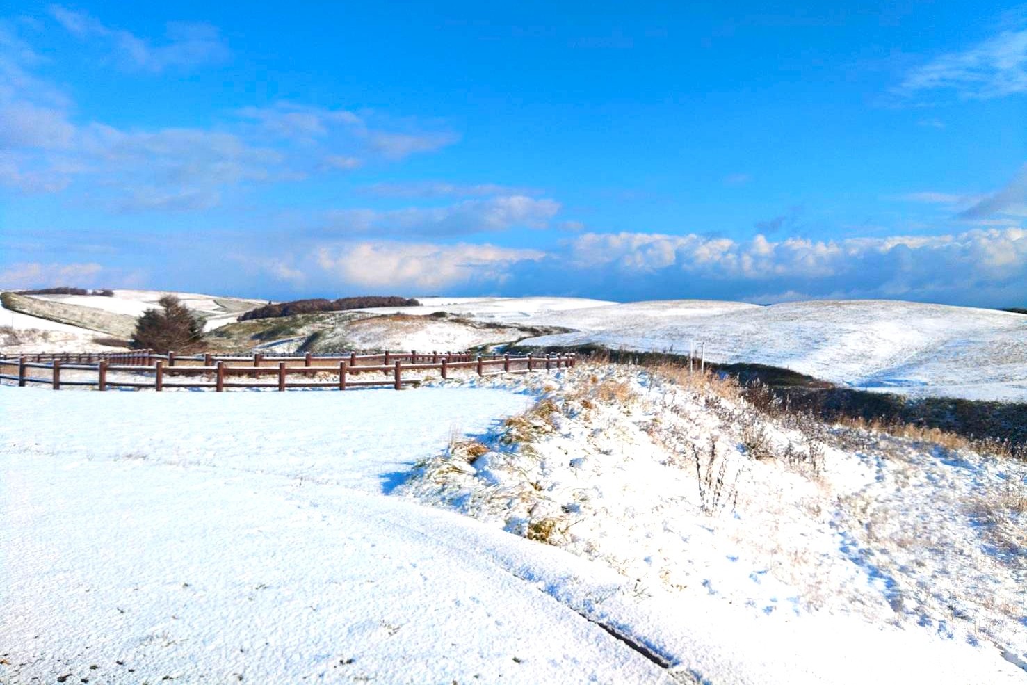 薄っすら雪が積もった大規模草地牧場は、この季節にしか見られない美しさがあります。
