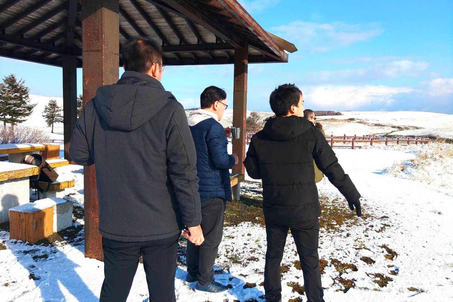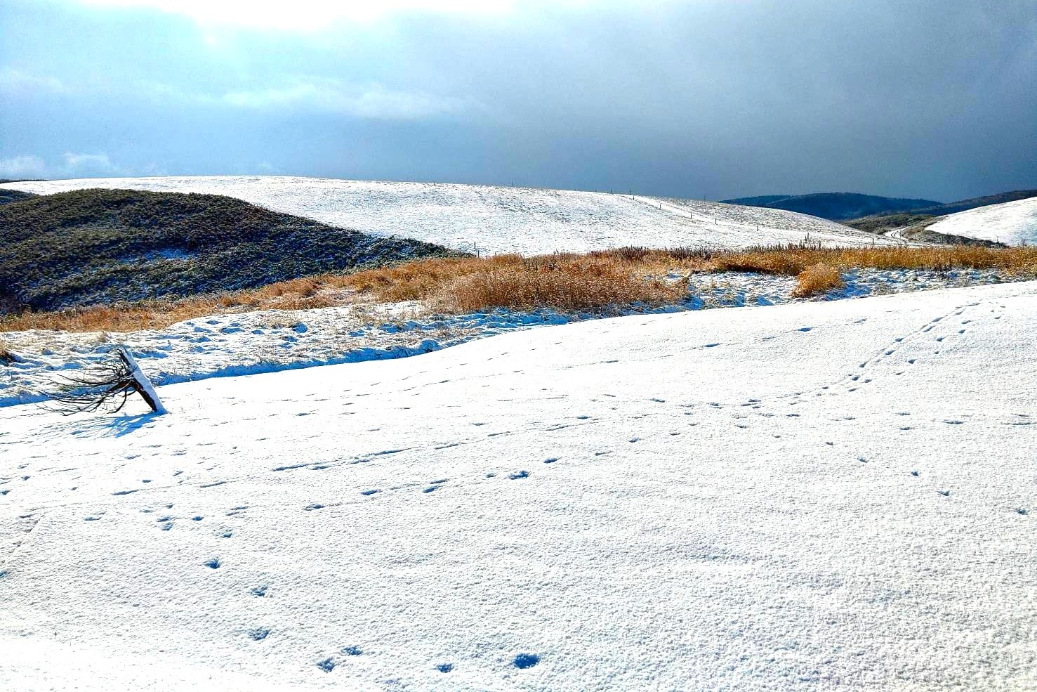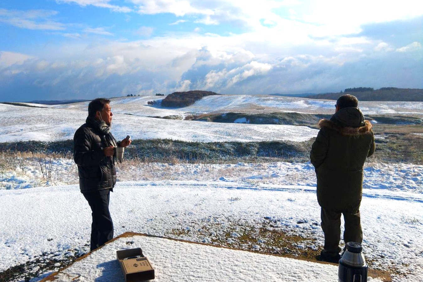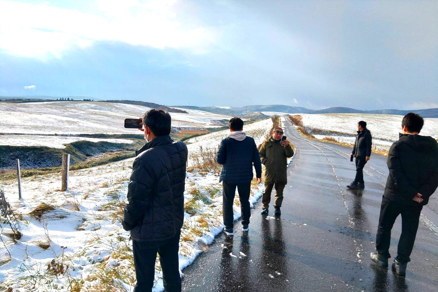 薄っすら雪が積もった大規模草地牧場は、この季節にしか見られない美しさがあります。