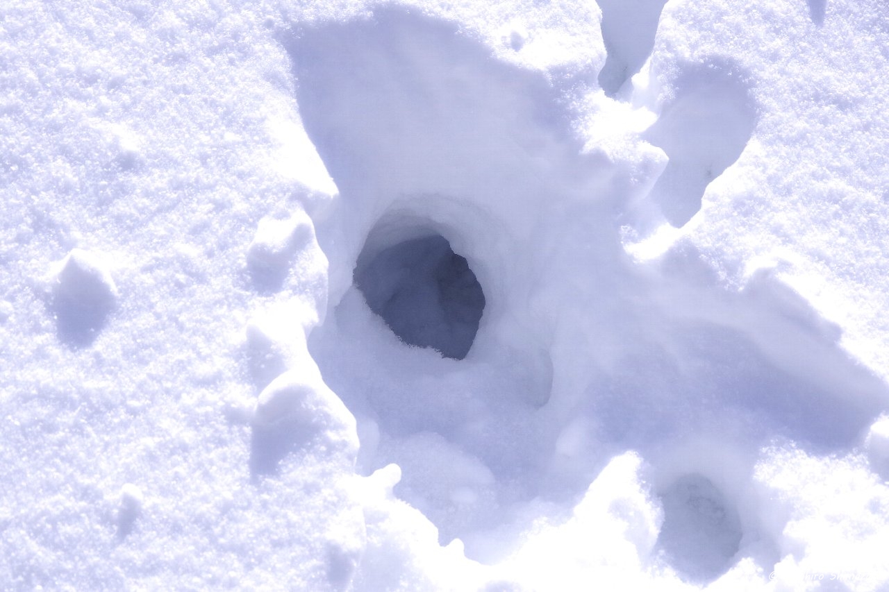 キツネの足跡をたどっていくと、穴を掘ってネズミを探した穴がありました。ネズミさん、捕まえたかな?