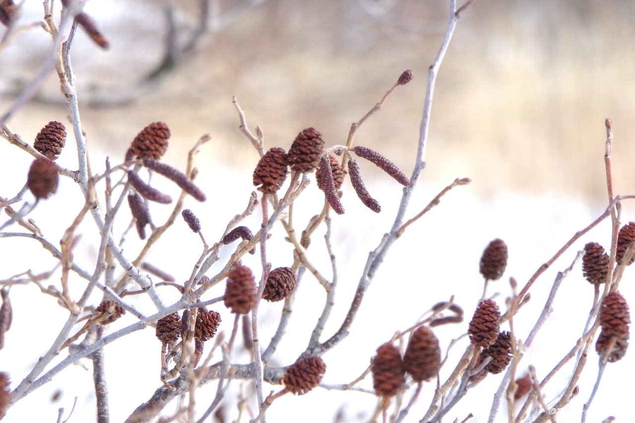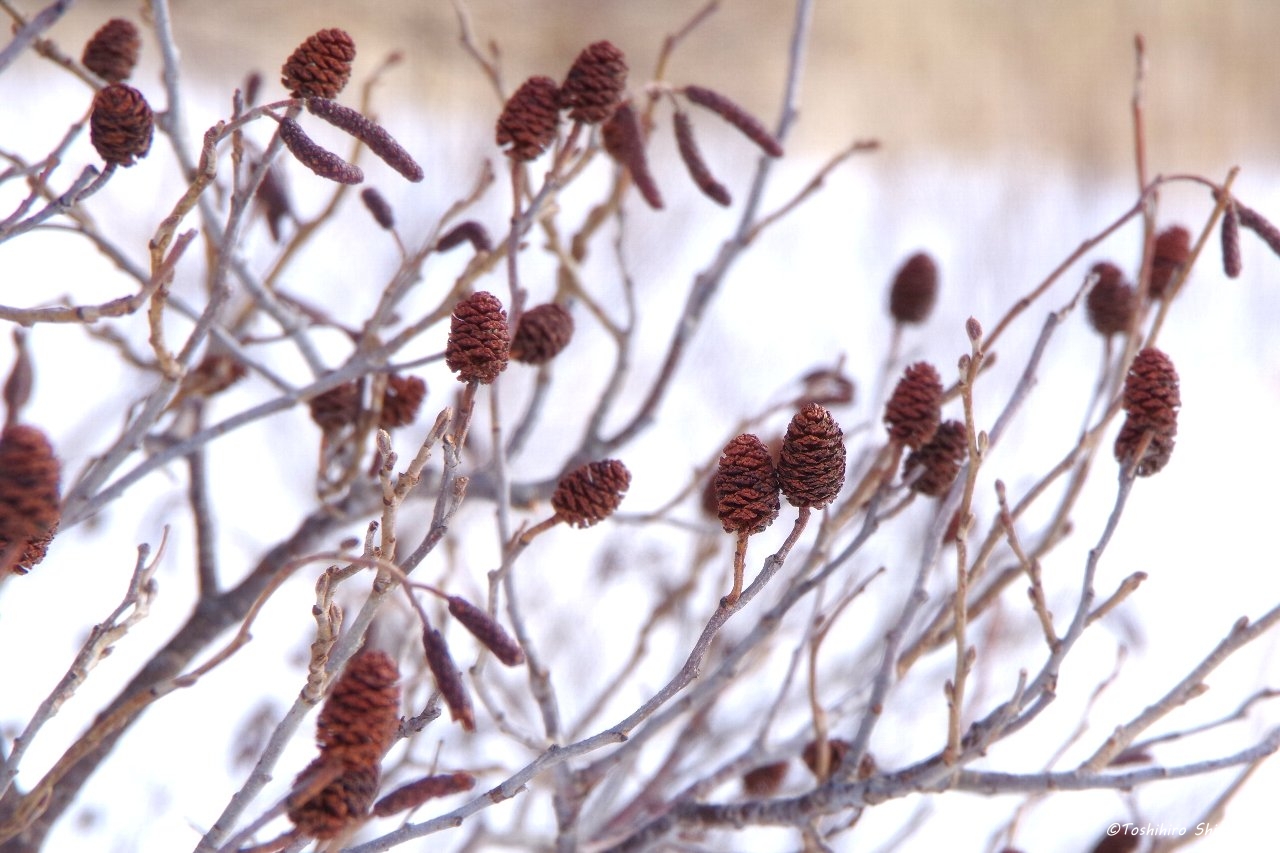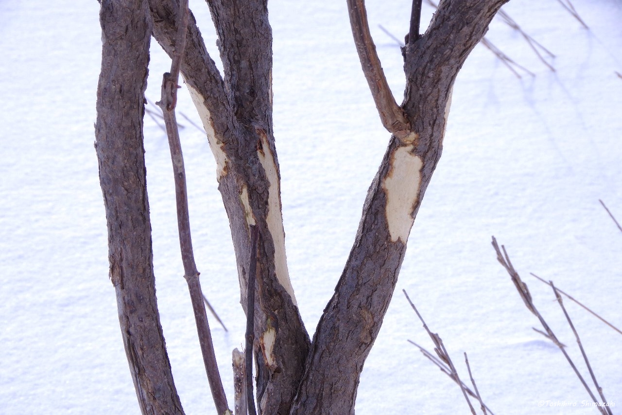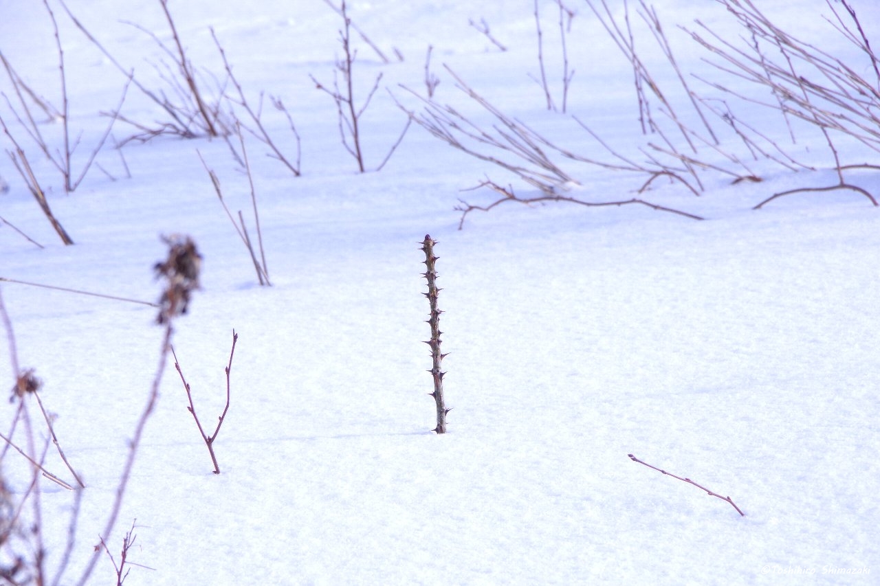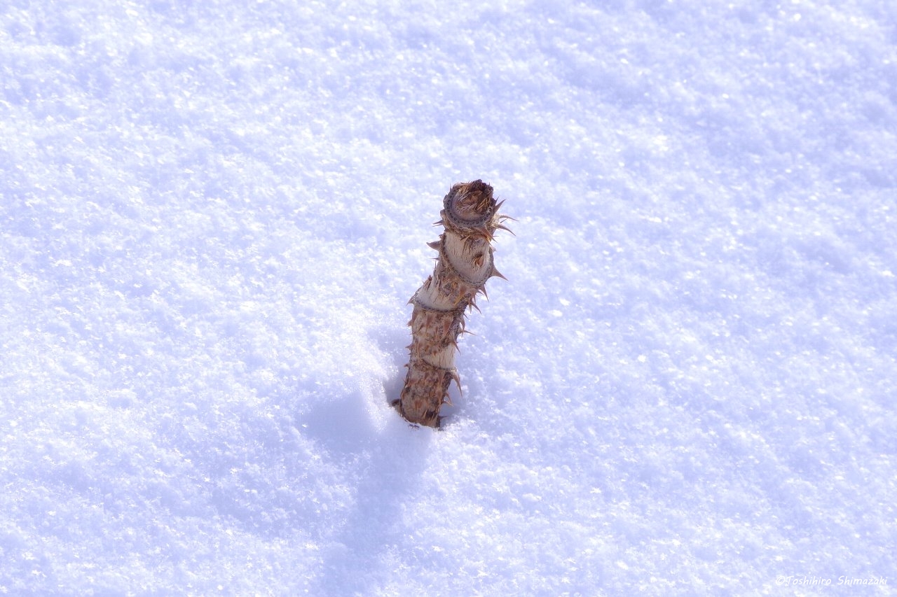 さらに丘を登っって行くと、タラノキやハリギリの木が雪の上に顔を出していました。