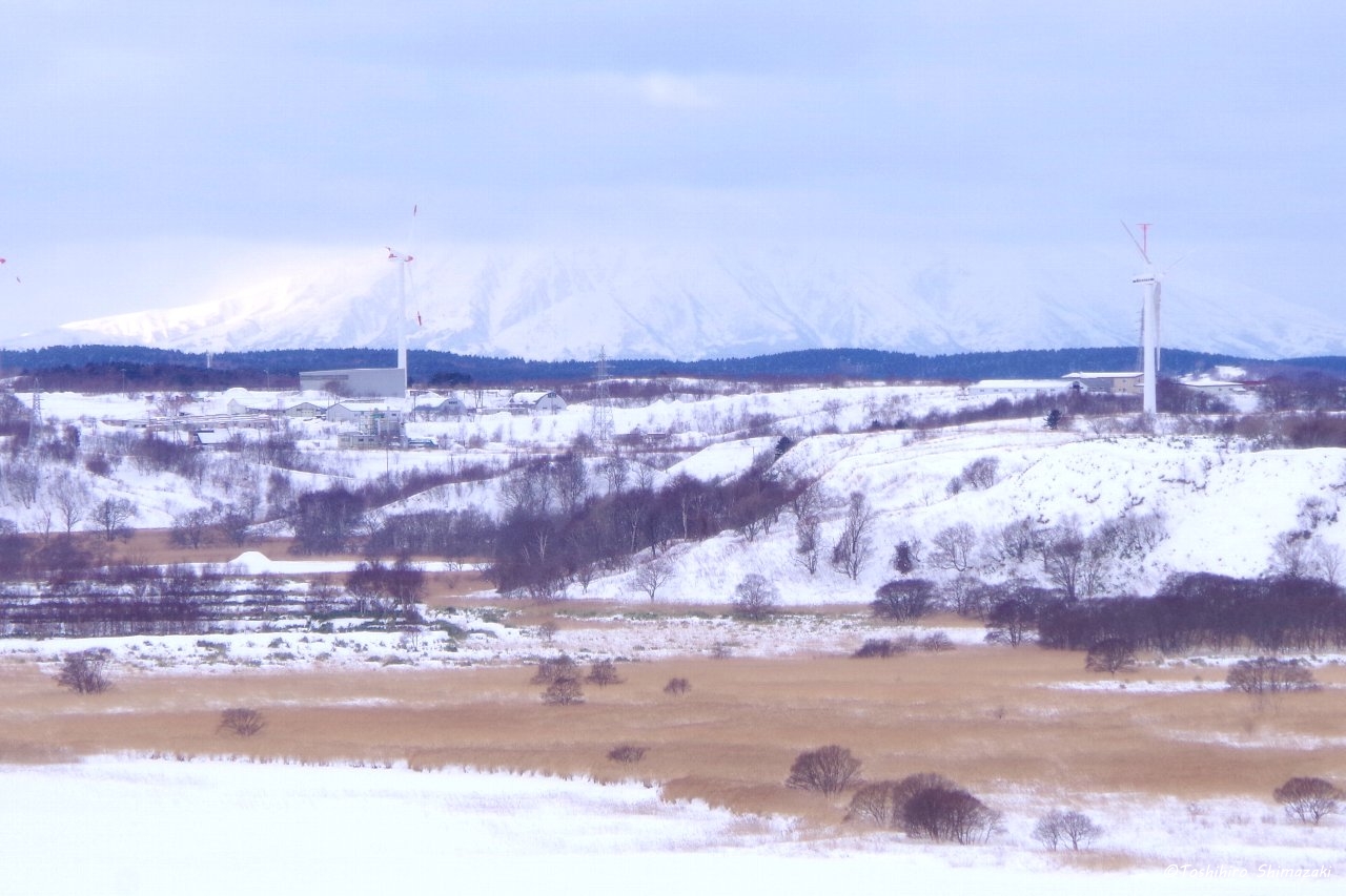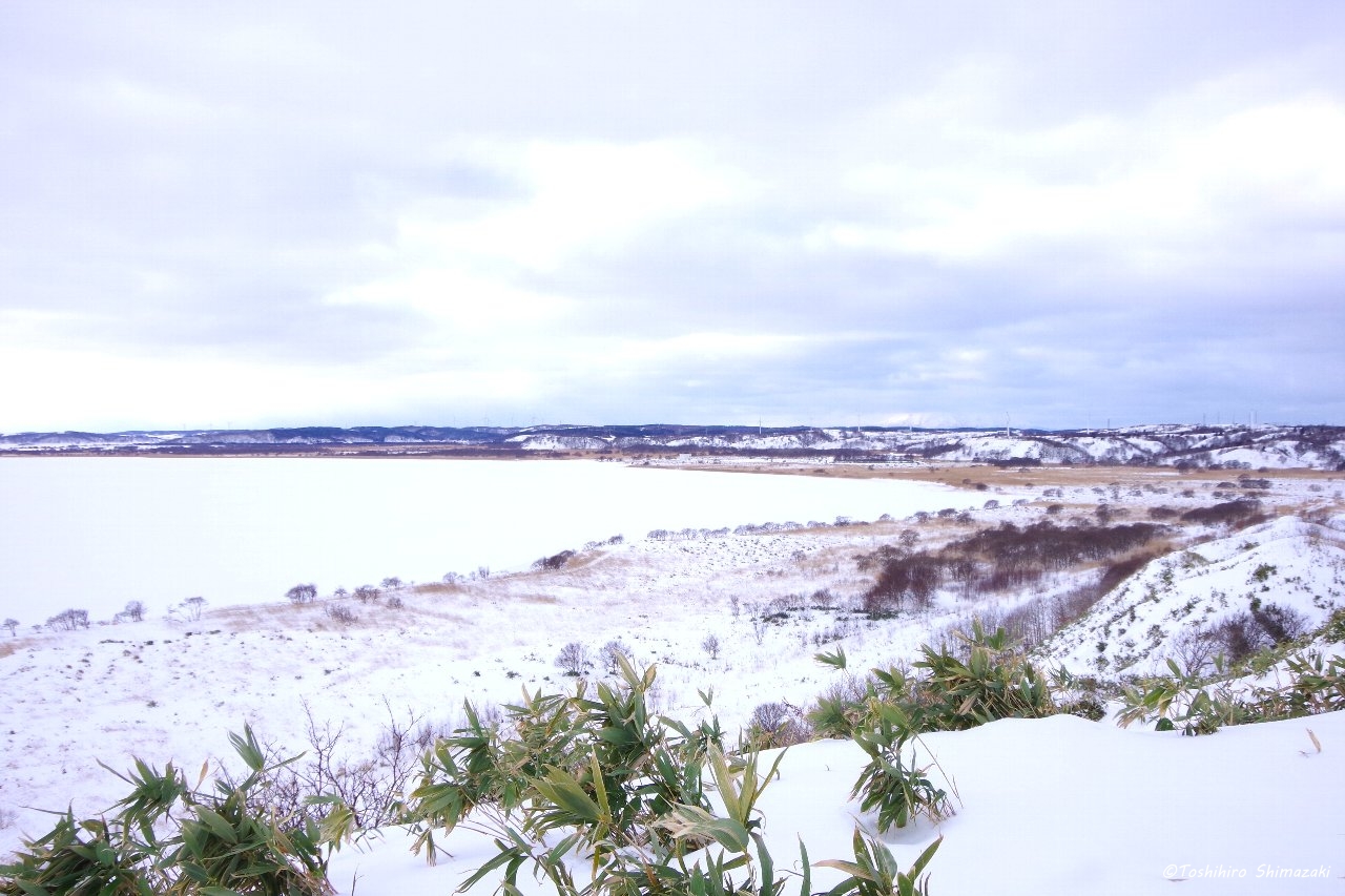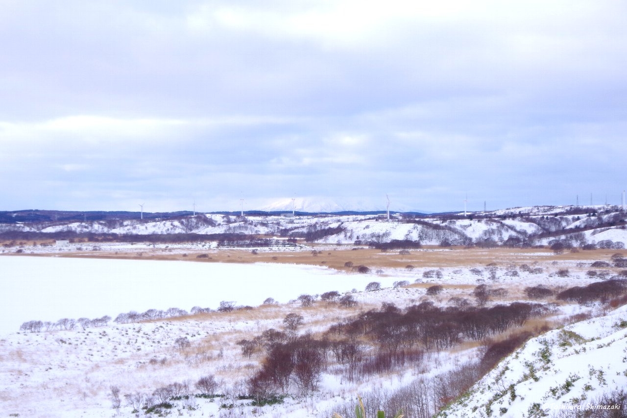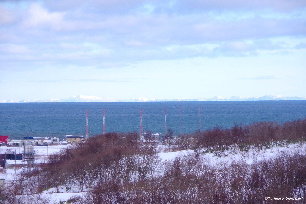 当日は曇り空でしたが、宗谷海峡の先にはサハリンもクッキリ。利尻島も中腹が雲間に見えていました。シュプントー展望台からは稚内大沼が一望できました。ちょうど、氷上で行われる自動車の走行会「スノーアタック」のコース整備中の様子も見ることができました。