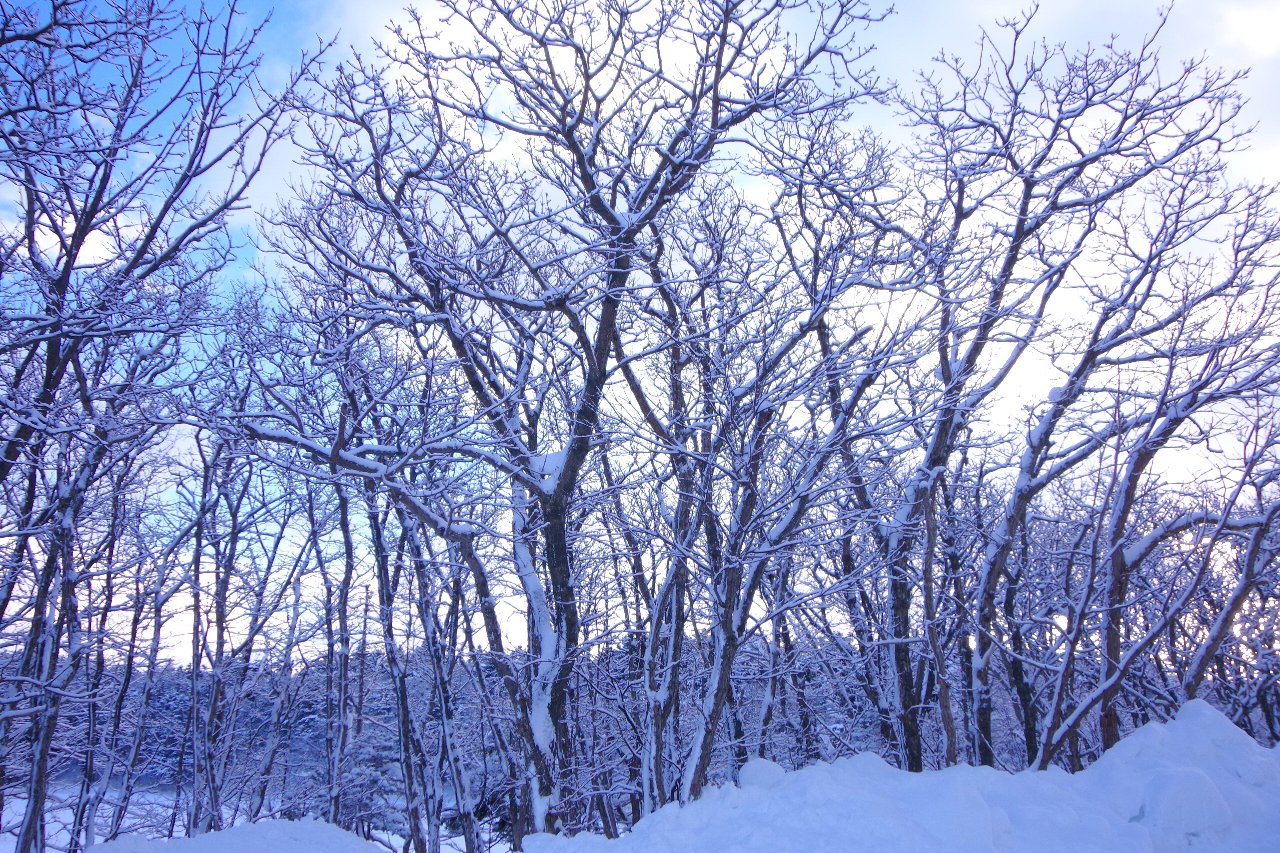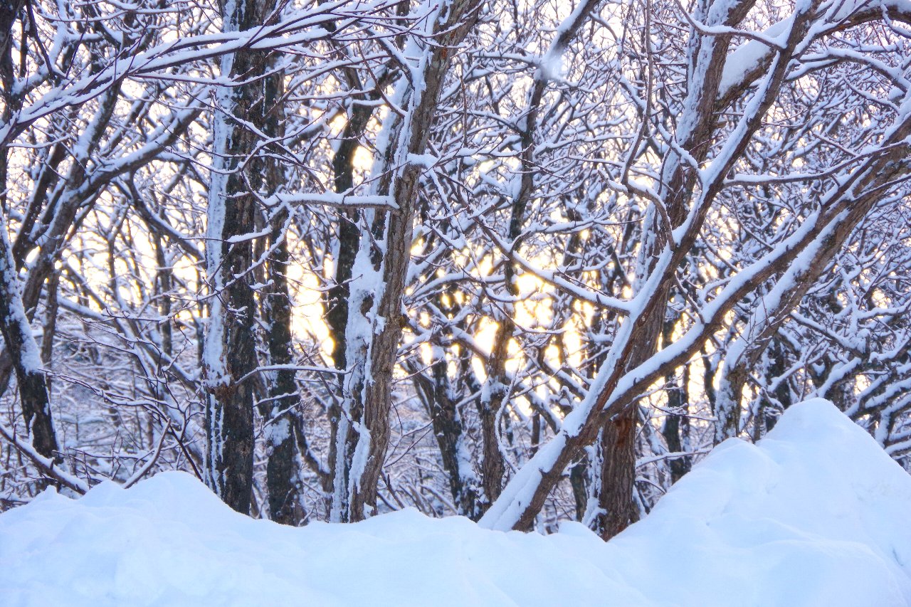 徐々に東の空が明るくなり、木々の向こうに柔らかな朝陽が射してきました。