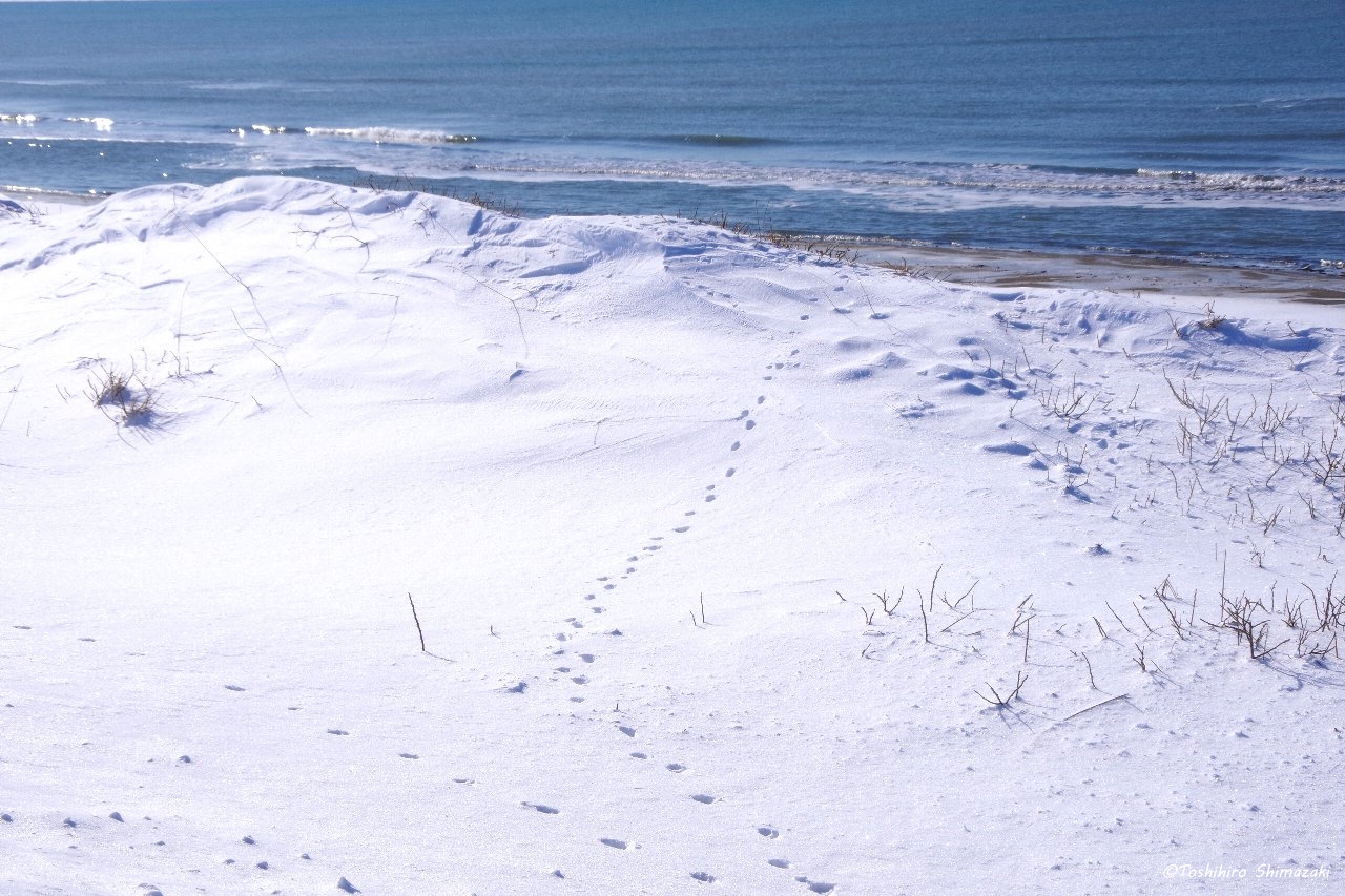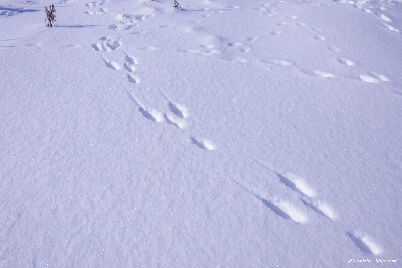 雪の上には、キツネやウサギの足跡。