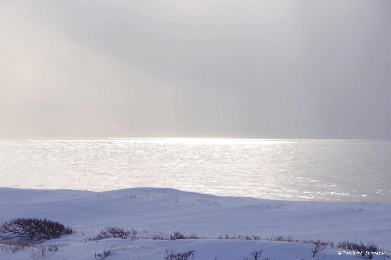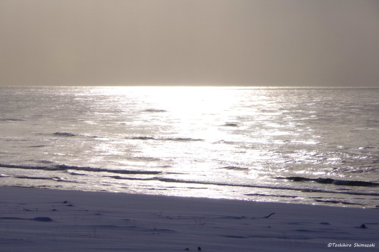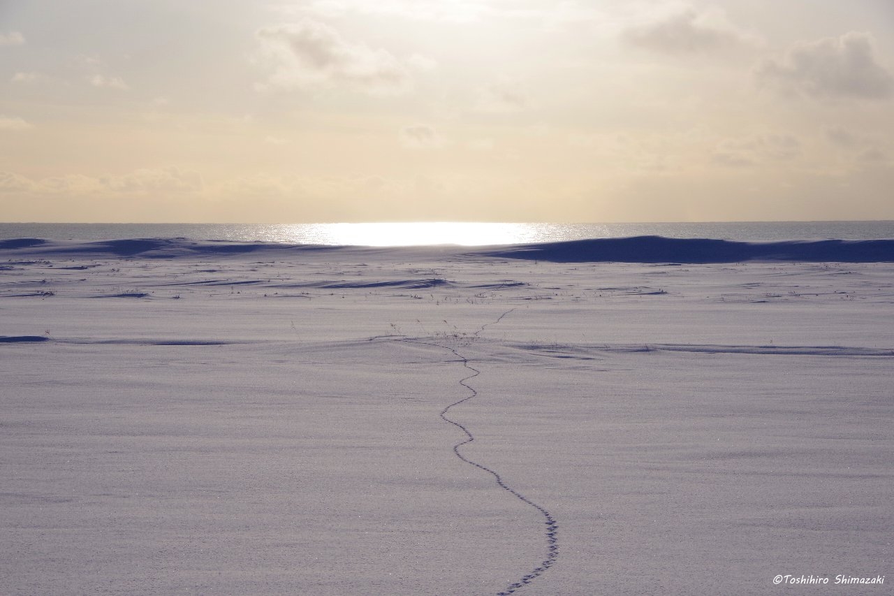 空が少しずつオレンジ色に染まり始め、雪原から海へと続くキツネの足跡を優しく照らし出してました。