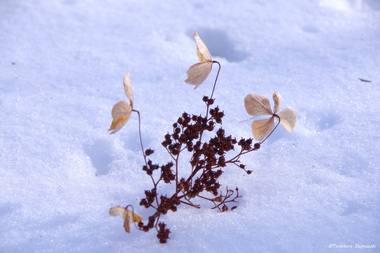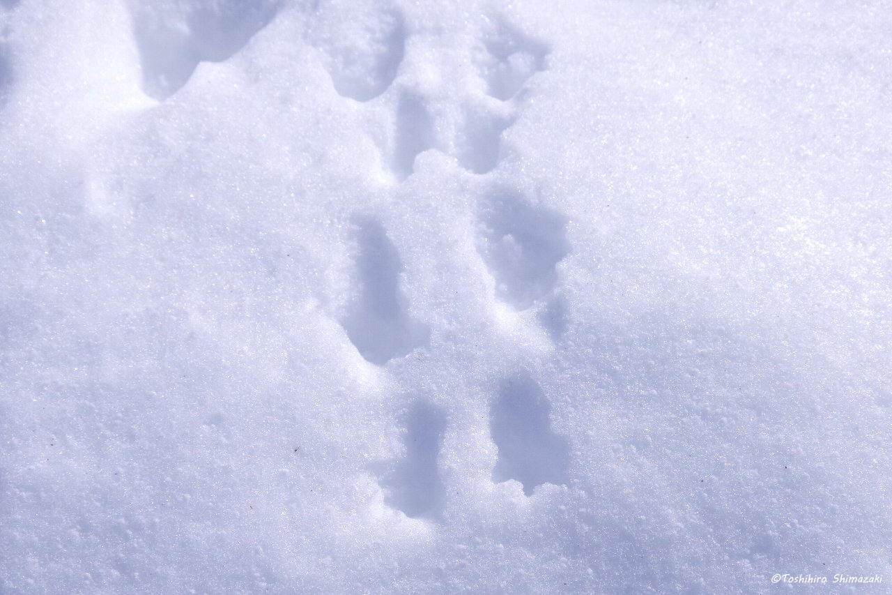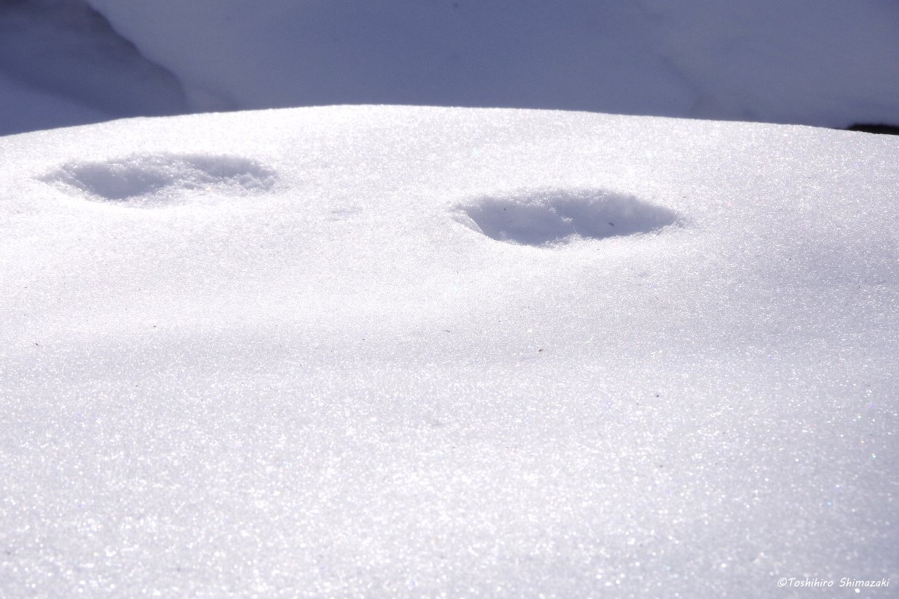 すっかり真っ白な世界になり、雪の上には、エゾリスやエゾクロテン、キタキツネ、エゾユキウサギなどたくさんの動物たちの足跡やツルアジサイのドライフラワーが落ちていました。