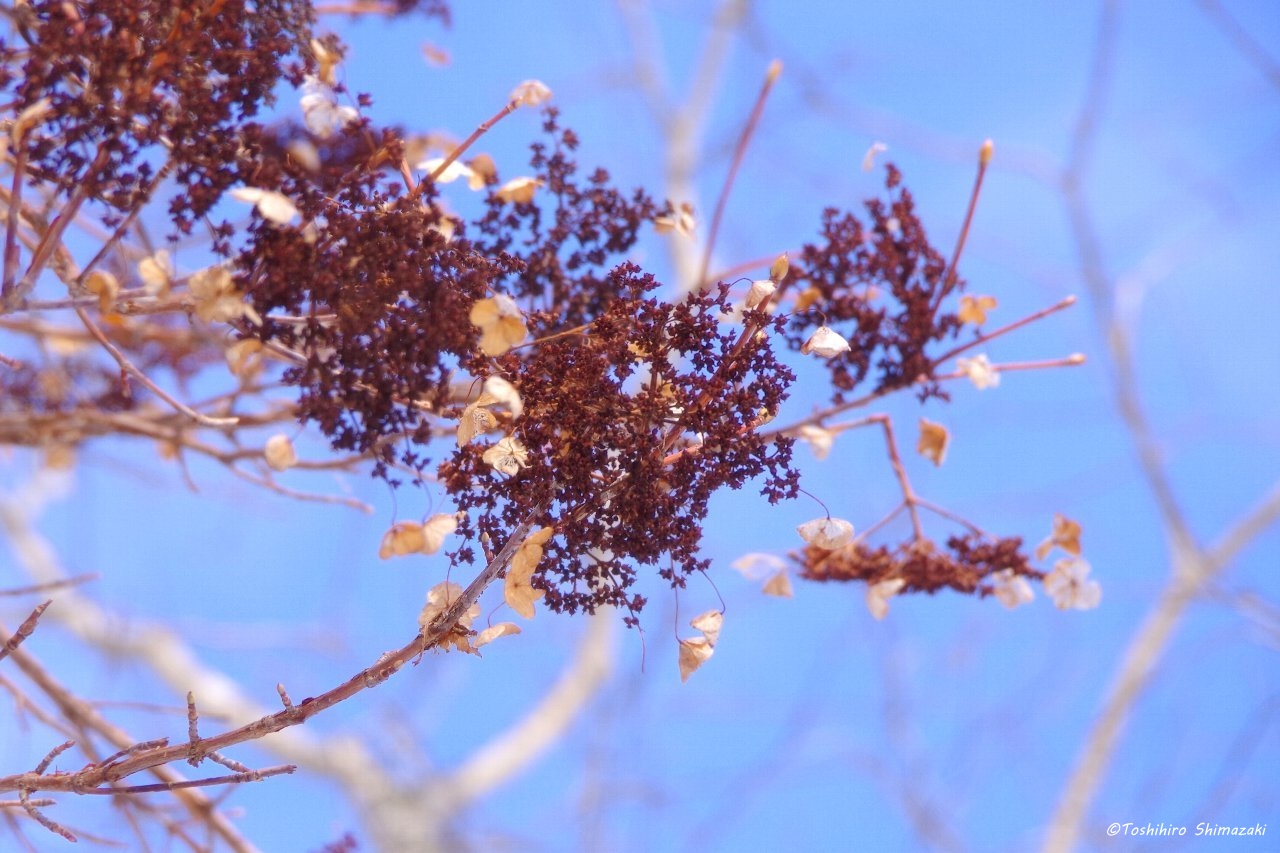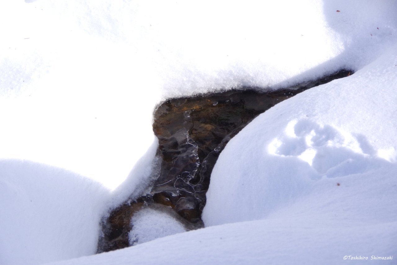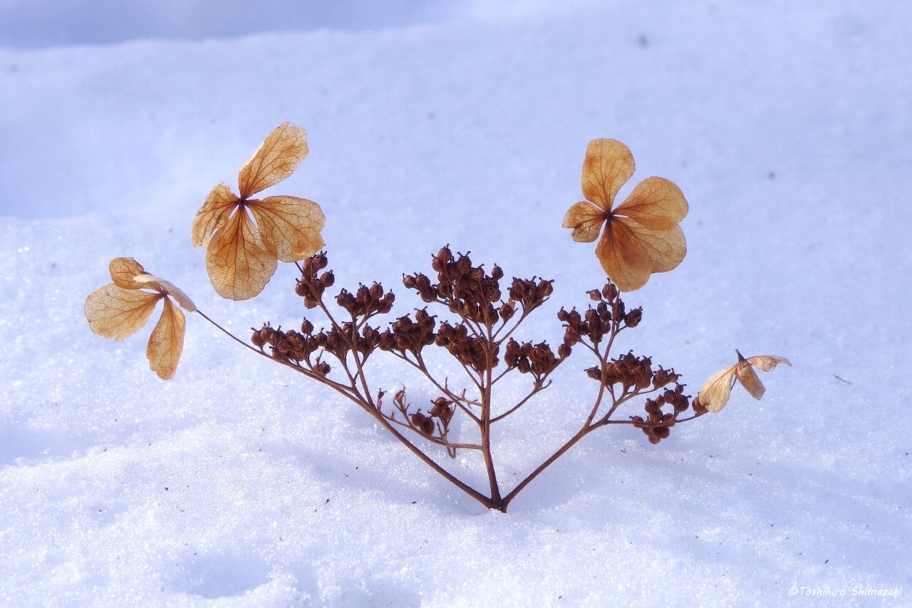 すっかり真っ白な世界になり、雪の上には、エゾリスやエゾクロテン、キタキツネ、エゾユキウサギなどたくさんの動物たちの足跡やツルアジサイのドライフラワーが落ちていました。