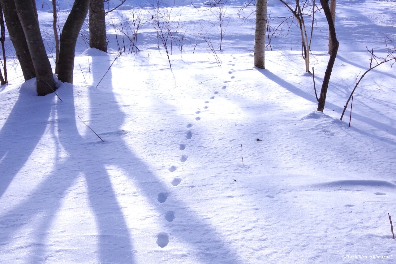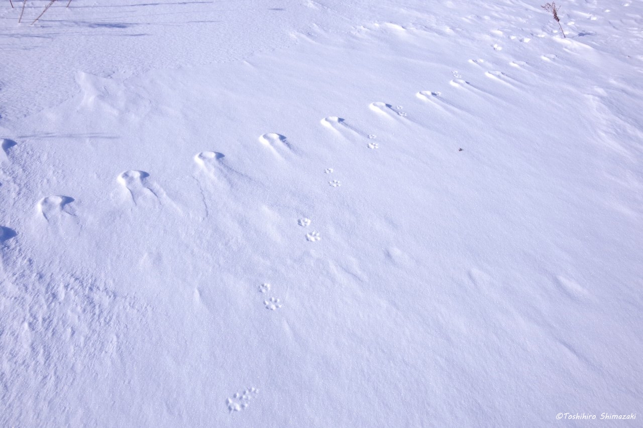 吹きすさぶ風で固くしまった雪の表面には、動物たちの足跡がくっきりと残っていました。