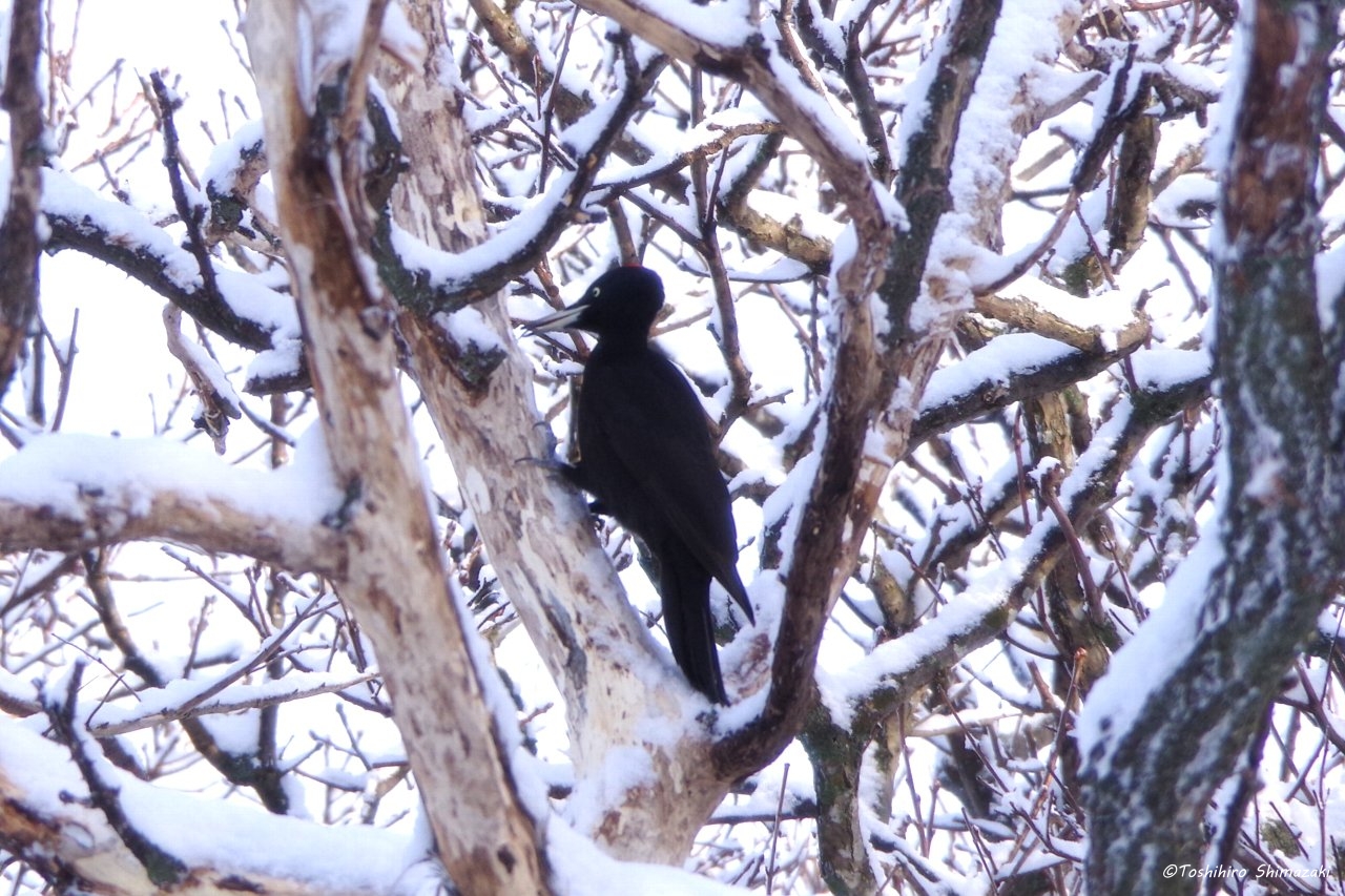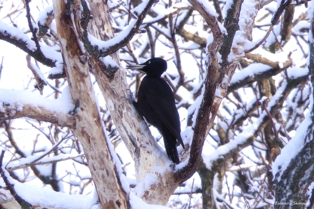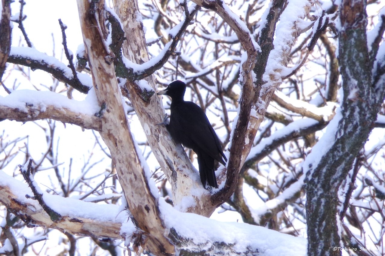暴風雪が収まった翌朝、仕事に行こうと家を出ると、自宅横の森の奥からクマゲラの甲高い鳴き声が聞こえてきました。