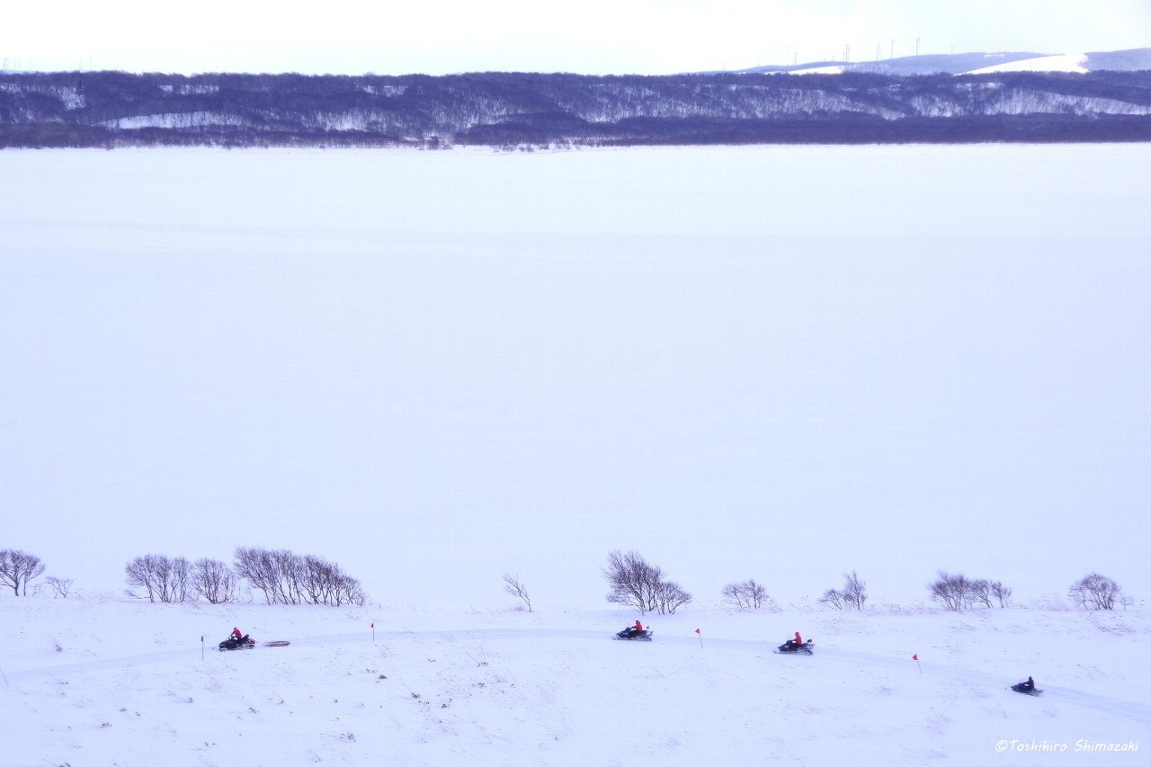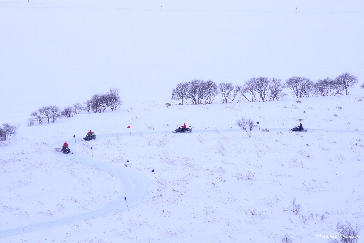 展望台から眼下を覗き込むと、ちょうどスノーモービルが列になり走っていて、犬ぞりレース大会のコースを作っているところでした。