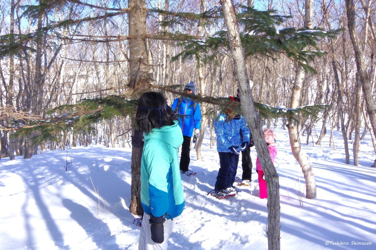 先週末は好天に恵まれて大阪と神奈川からの2組のご家族をご案内させていただきました。もちろん皆様スノーシューは初めてとのことでしたが、すぐに慣れて、美しい冬の森の景色や展望台からの眺望を満喫されていらっしゃいました。