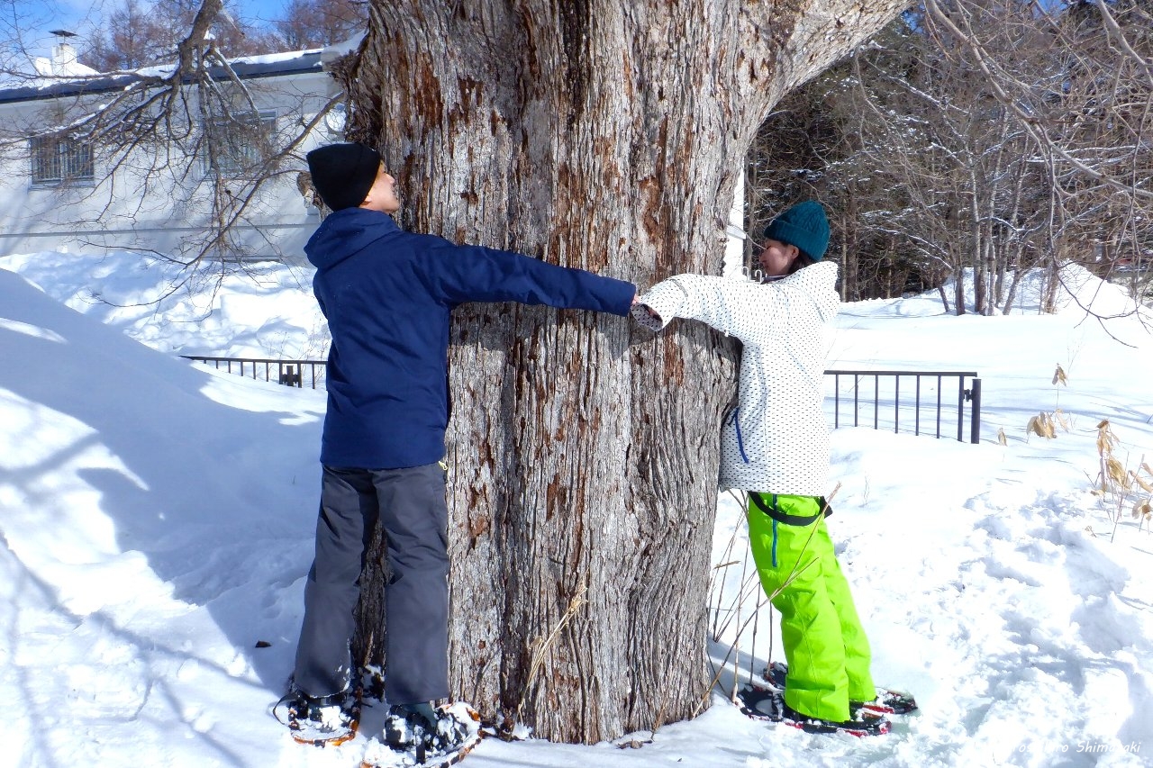 温泉街の近くの森を散策し、推定樹齢300年以上のハルニレの木に抱き着いたり、冬の豊富町の自然を楽しんでもらいました。