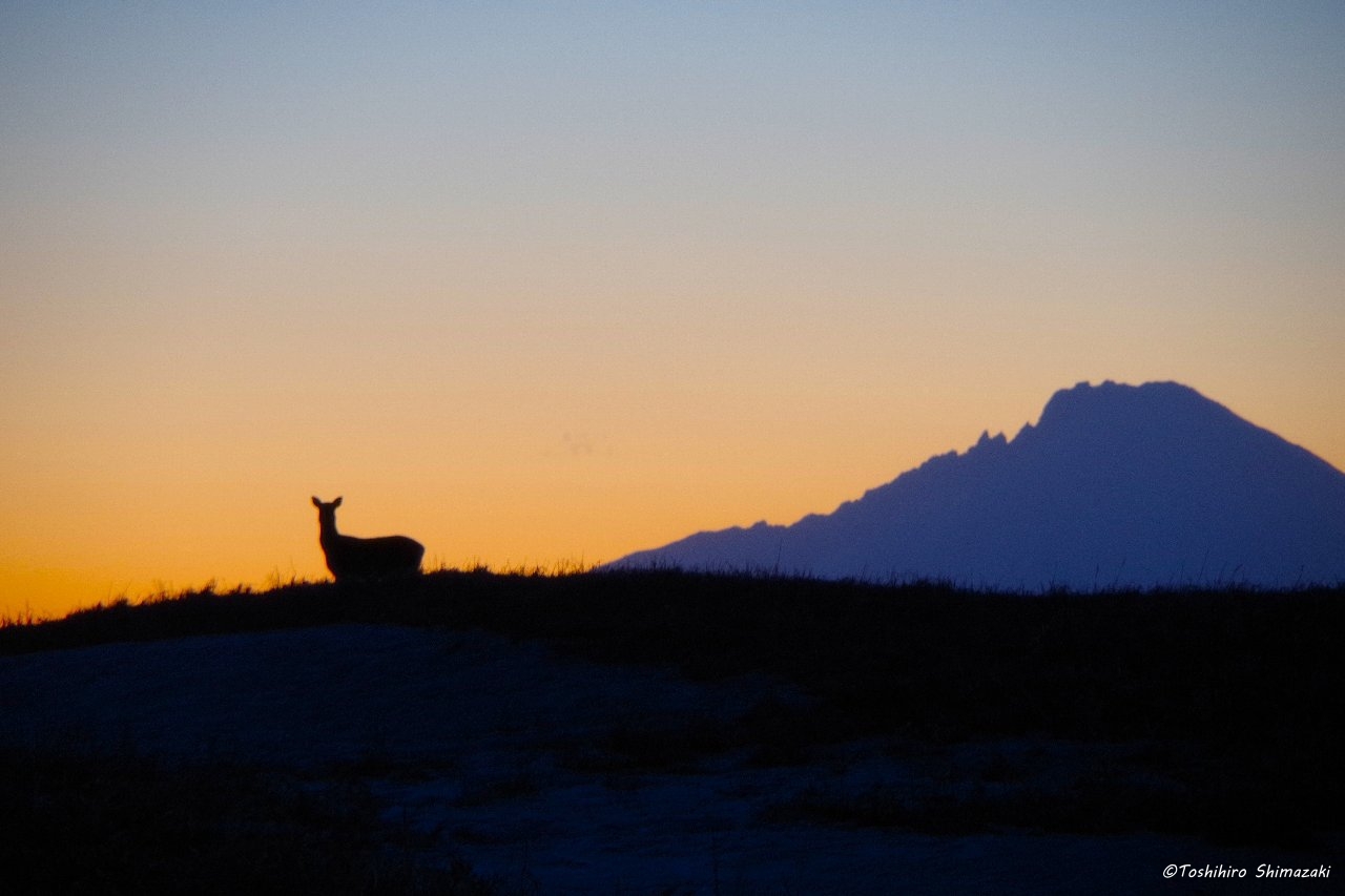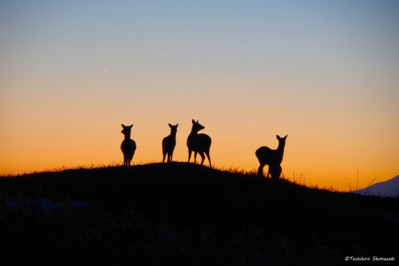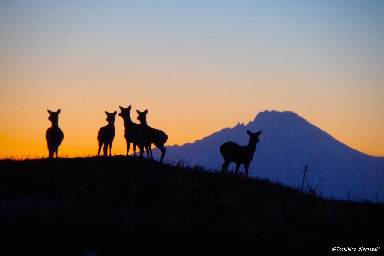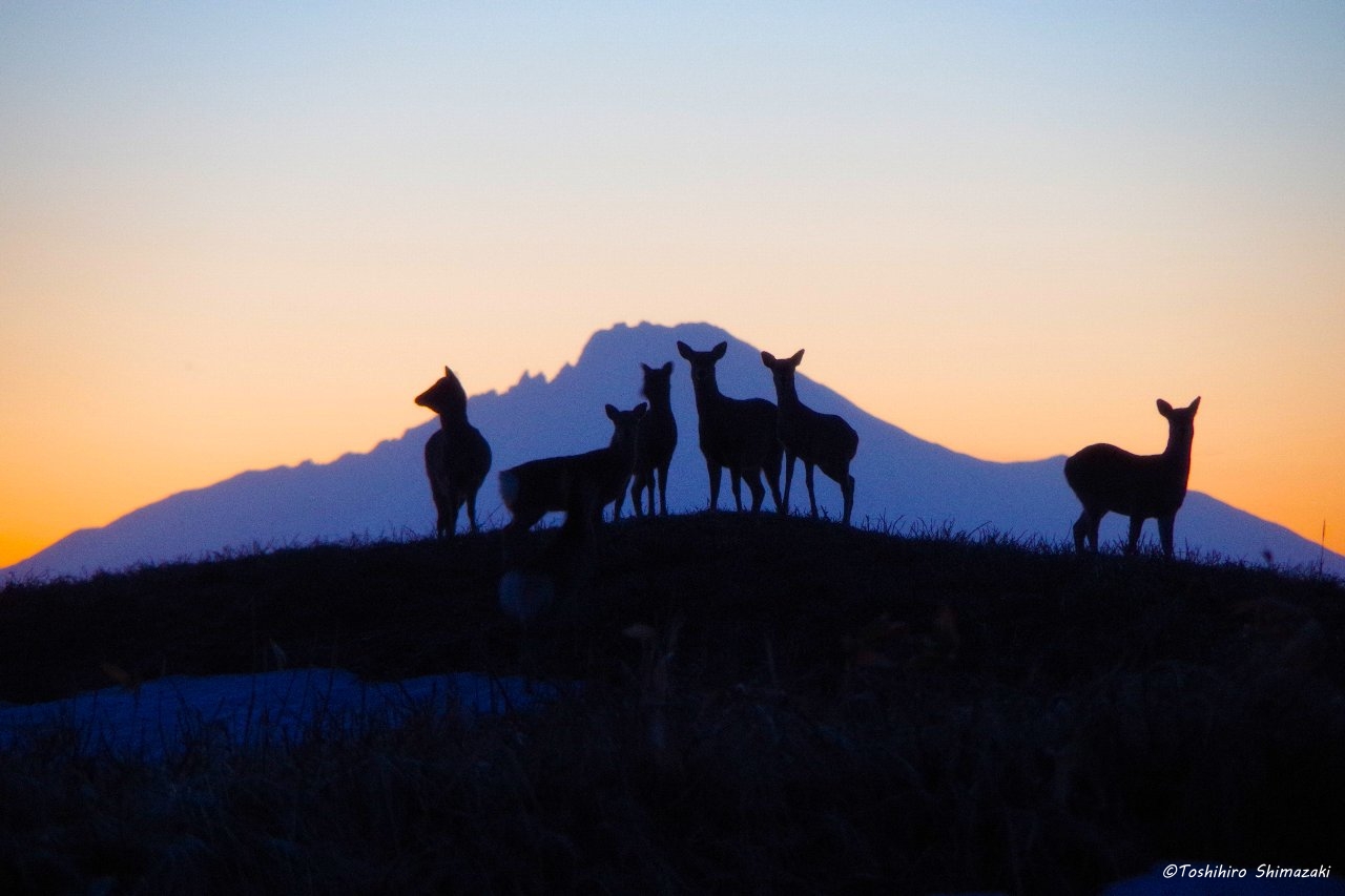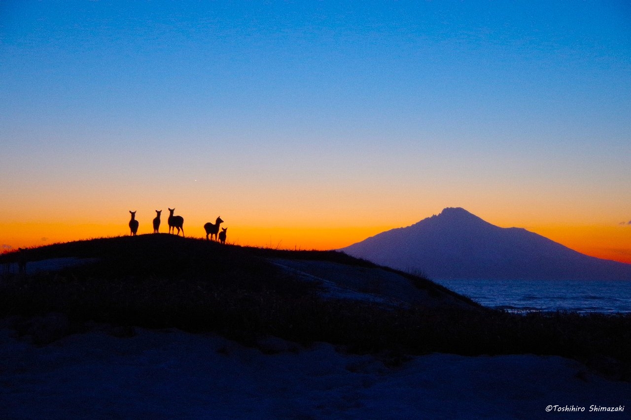 仕事帰りに海岸線の道を走っているとたくさんのシカのシルエットが利尻島をバックにカッコ良く浮かび上がっていました。