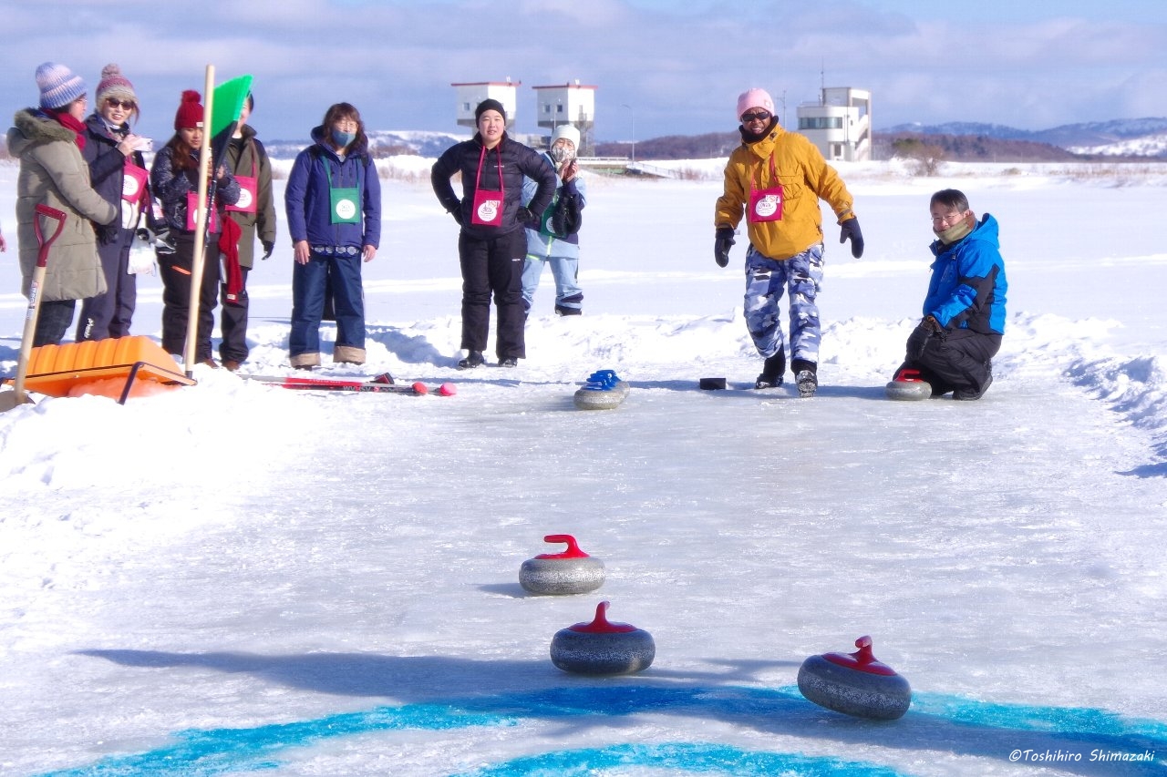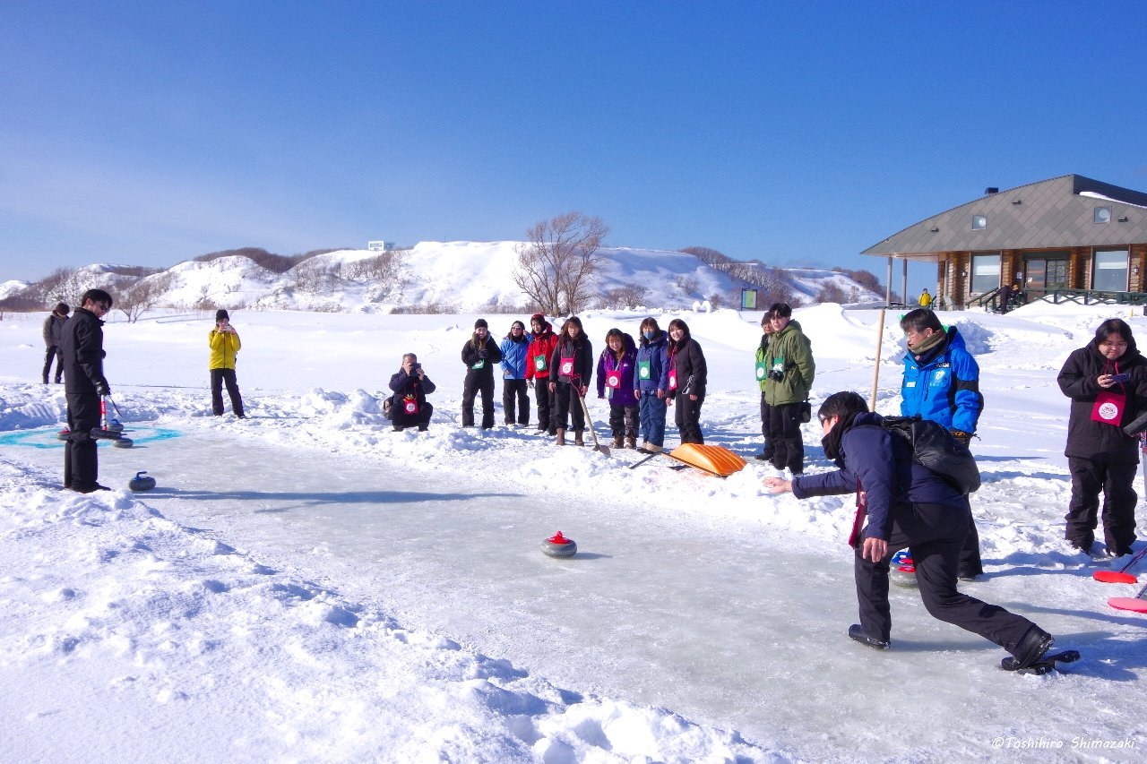 まずは、前回は暴風雪の影響で実施できなかった大沼氷上カーリングからスタート。みどりスポーツパークのスタッフさんが何日も前から準備して下さった特製の屋外カーリング場。