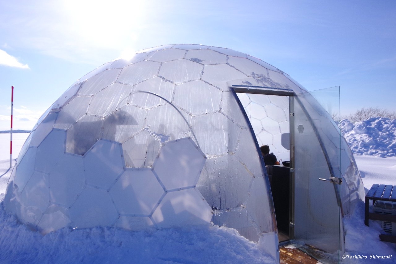 丘の中腹で絶景を眺めながら勇知いものポタージュを飲んで休憩した後は雪の滑り台へ。