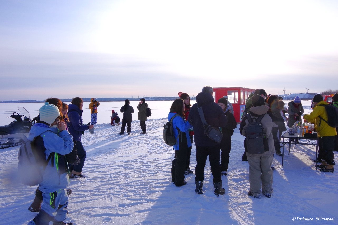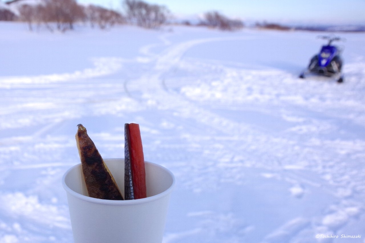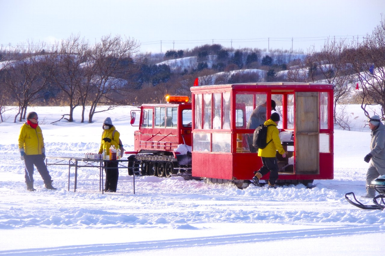 そして、遊覧雪上車まで歩いてここで、鮭とばやホッケスティックが振舞われ、最後は雪上車でふれあい公園まで戻ってきました。