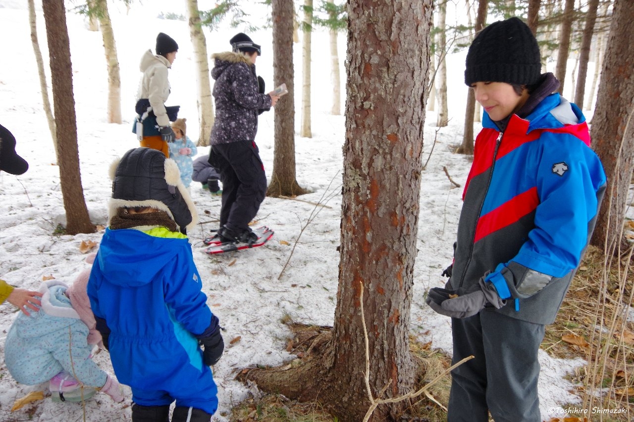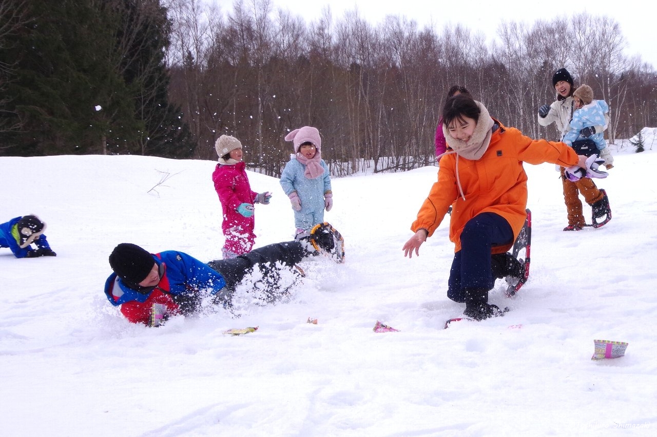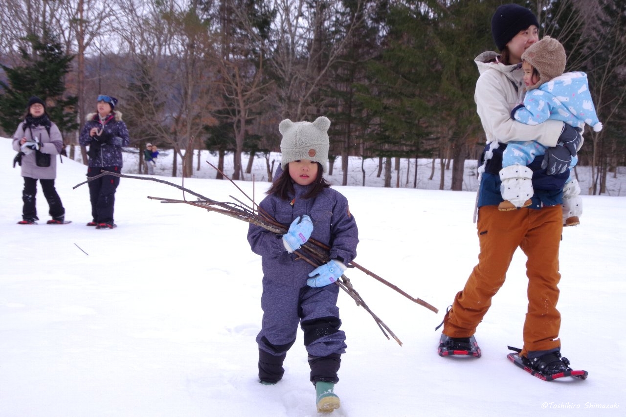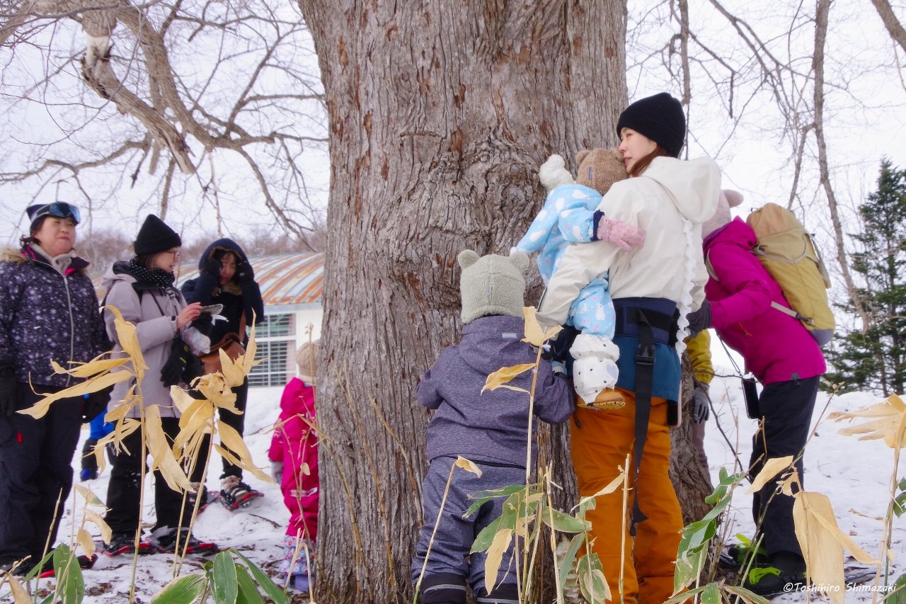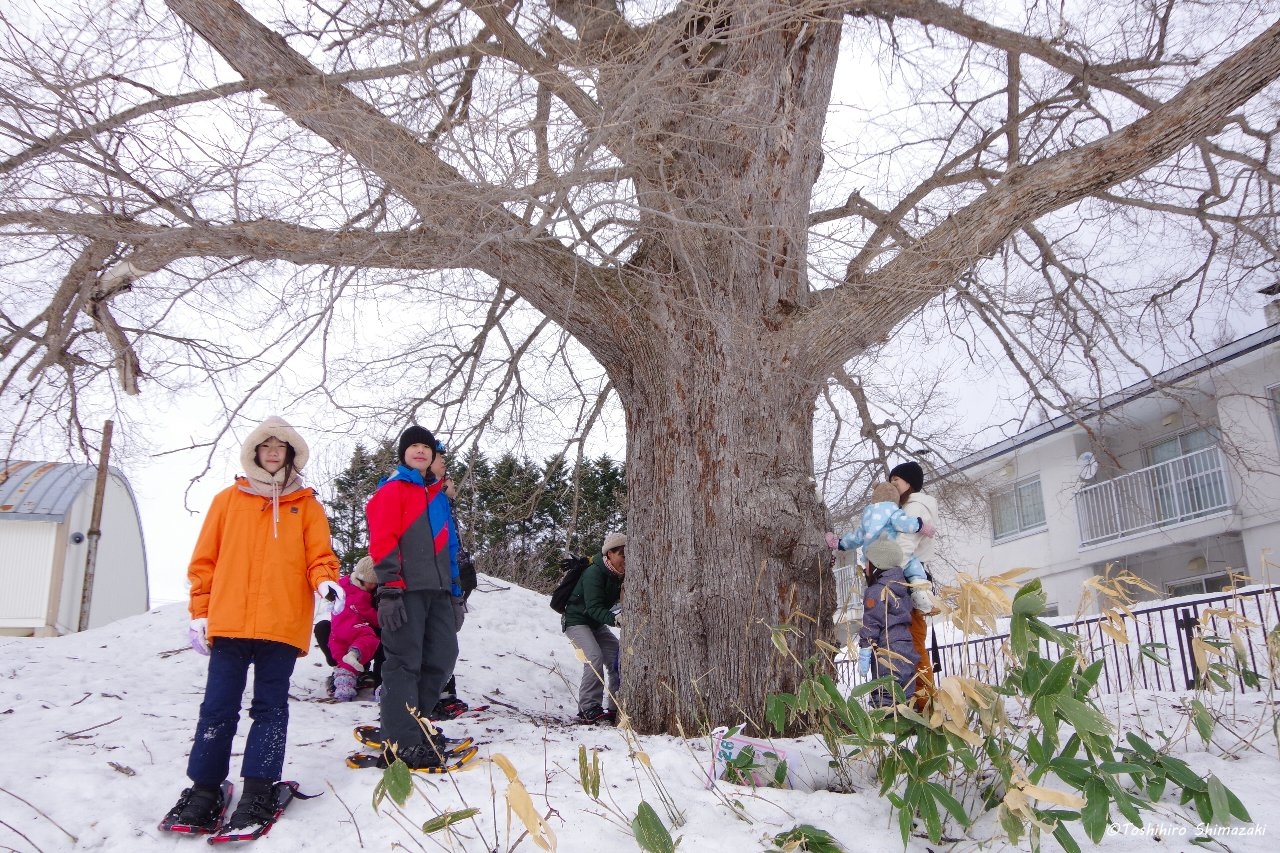 後半はずっと昔から豊富温泉と人々を見守ってきた推定樹齢300年以上のハルニレの木にご挨拶して、雪の滑り台を楽しみ、おやつ争奪スノーフラッグで盛り上がりました。