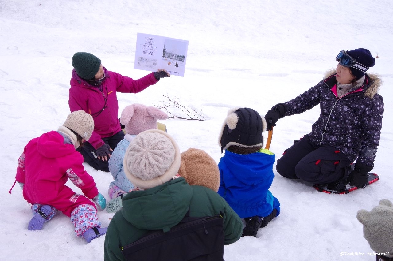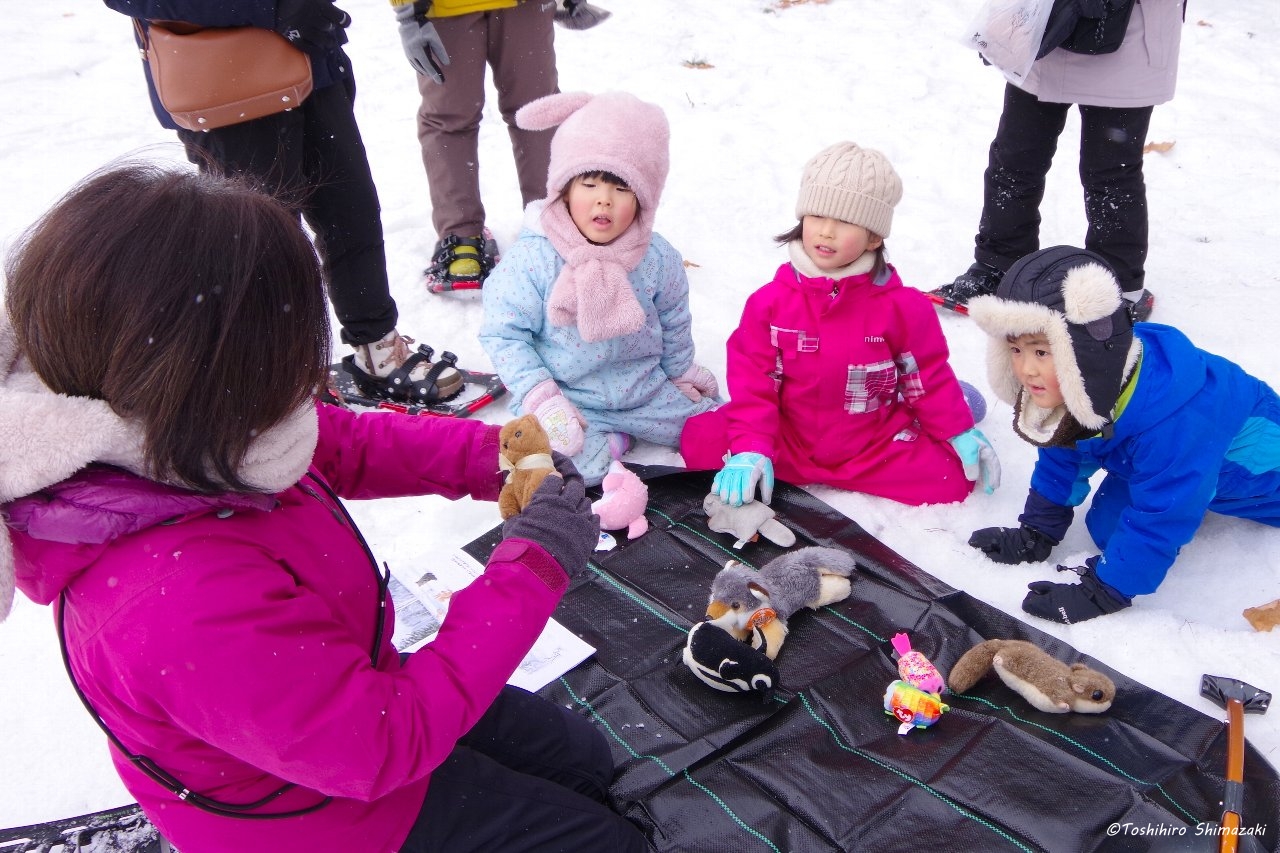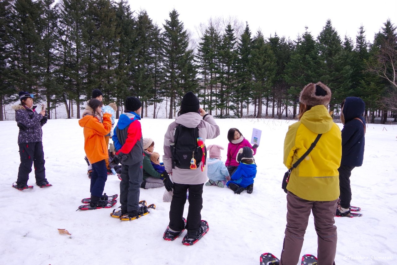 オリジナル絵本の物語に沿って進めていく魅力的なプログラムで、主人公・エゾユキウサギのユキちゃんと一緒に、冒険をなぞる形で親子で森散策を楽しんでいただきました。