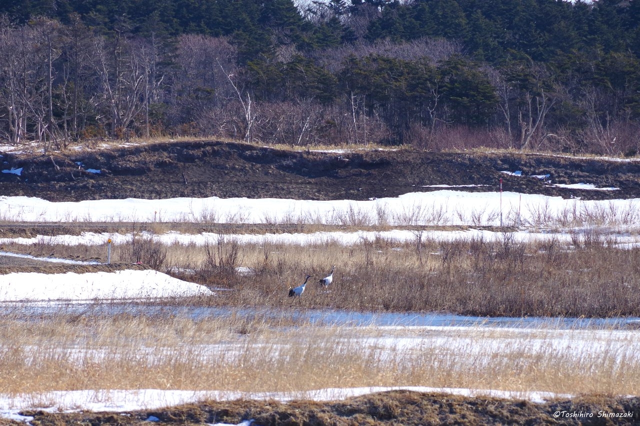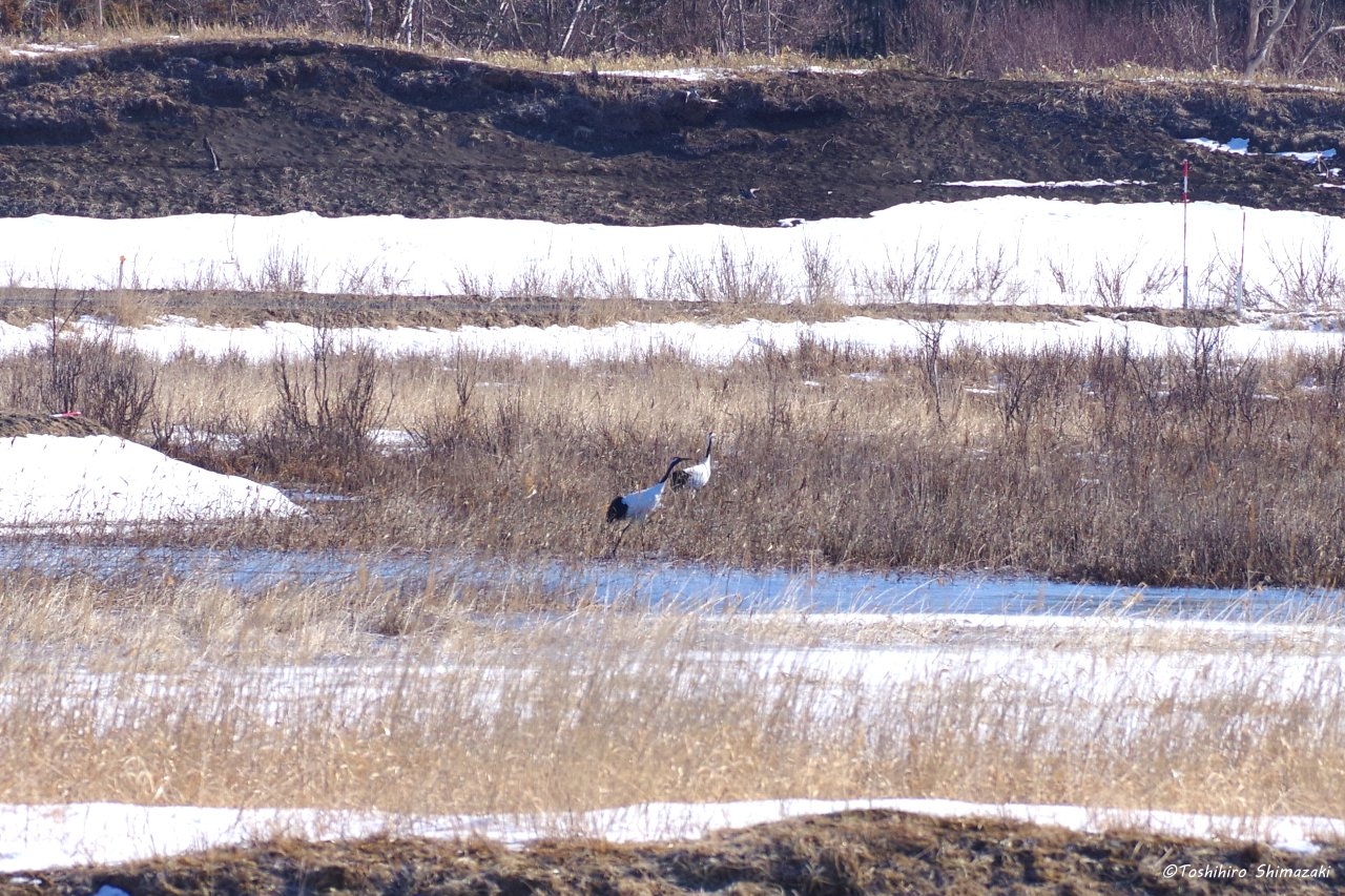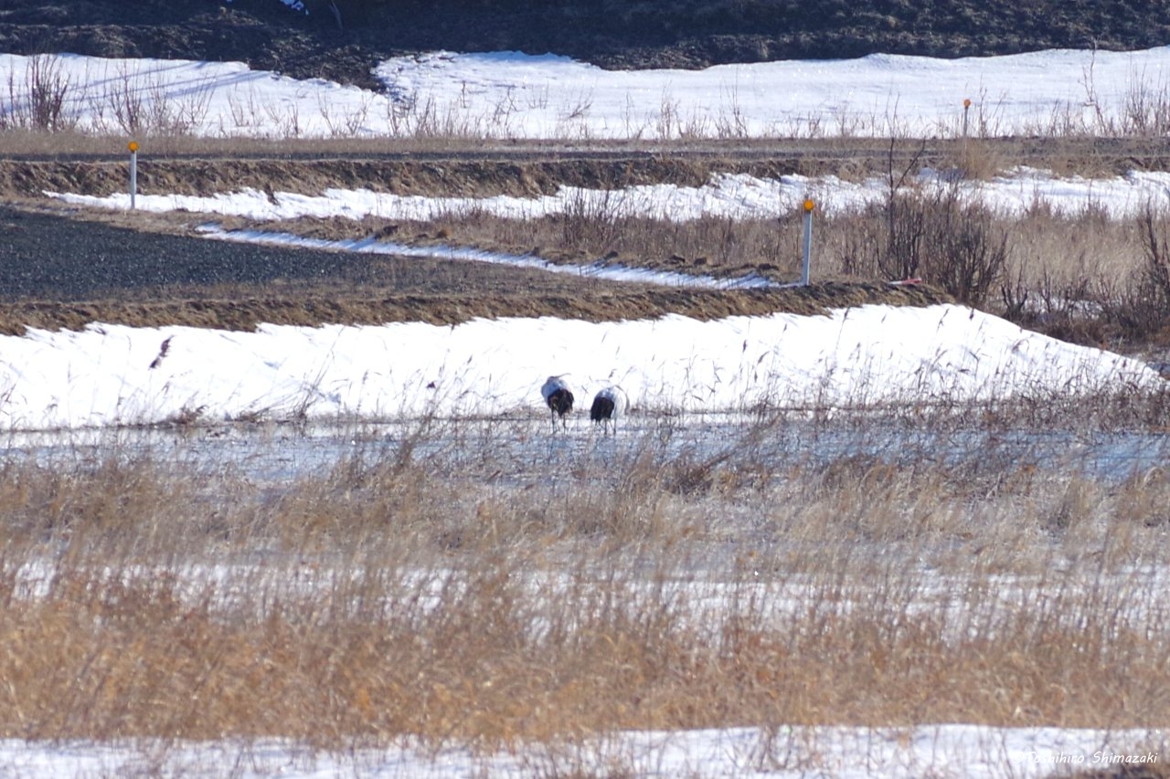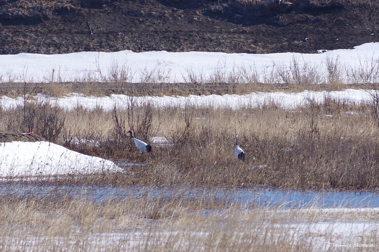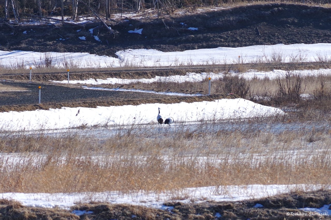 このつがいは雪どけ水がたまっている水辺の近くなどで、しばらく餌を探していました。昨年は子連れのタンチョウにあまり会わなかったので、今年こそは繁殖がうまくいってくれることを願っています。