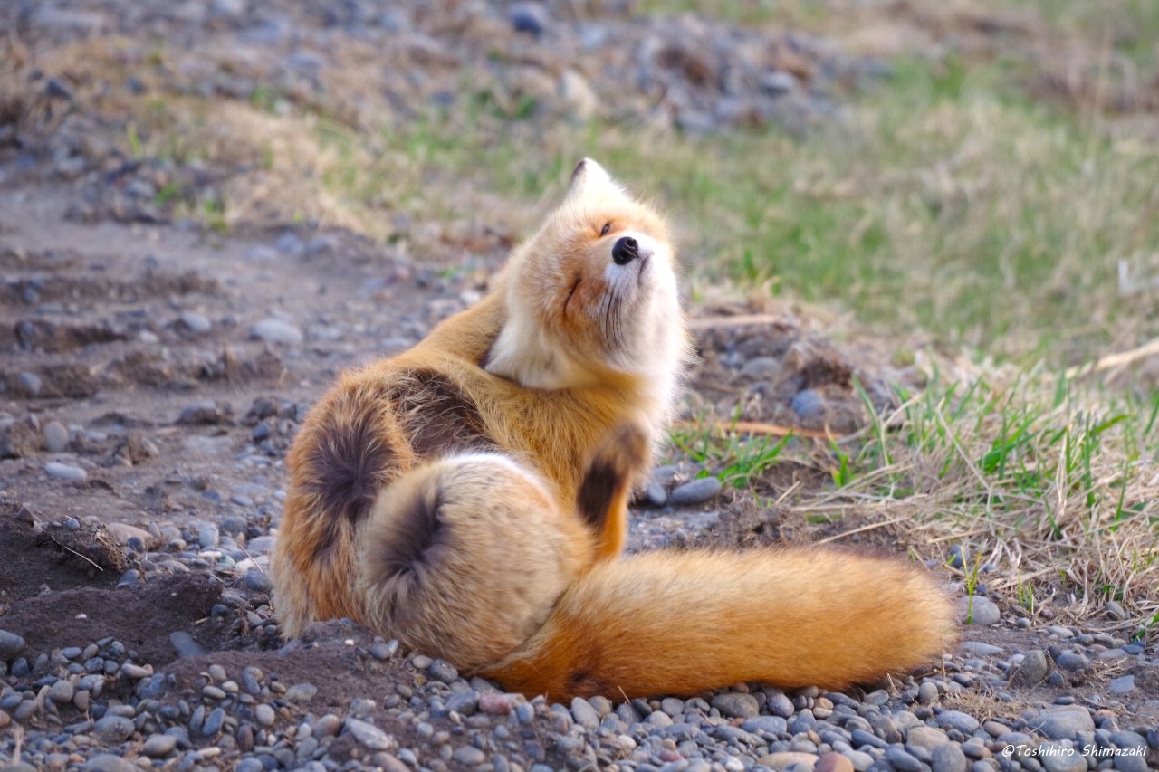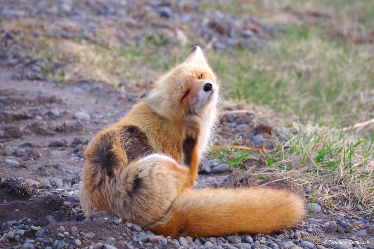 野鳥の調査でジーっと動かず外にいたら、すぐ横にキタキツネがやってきました。