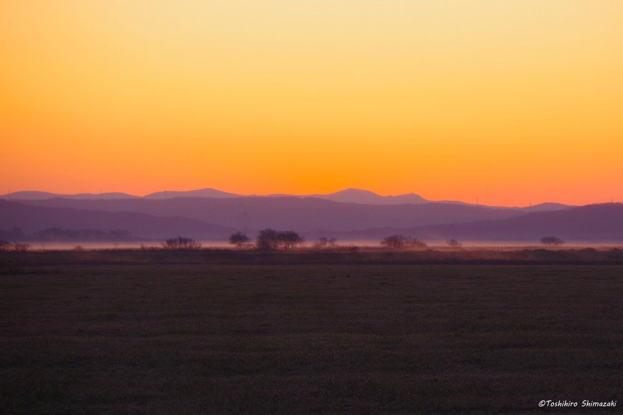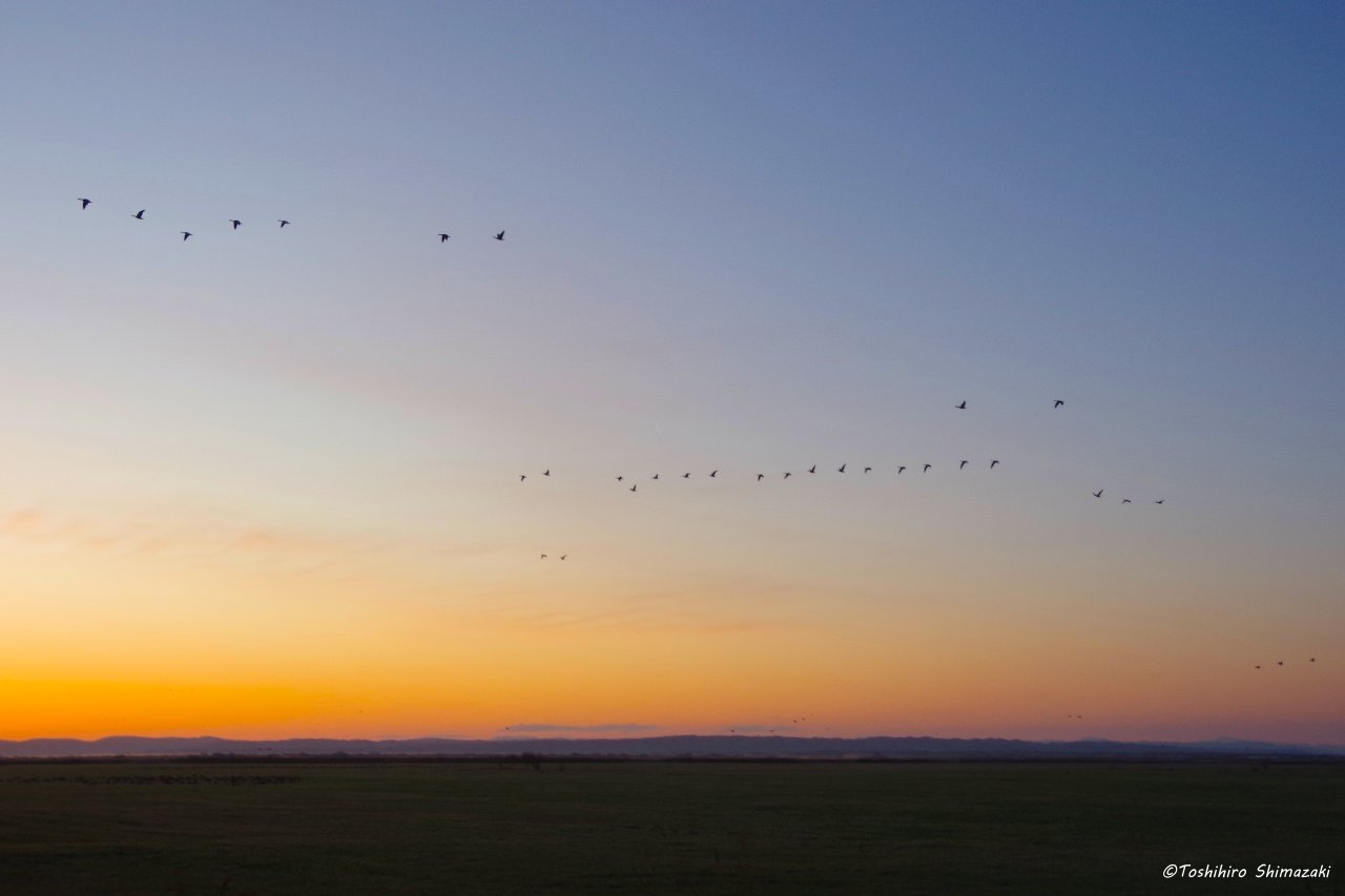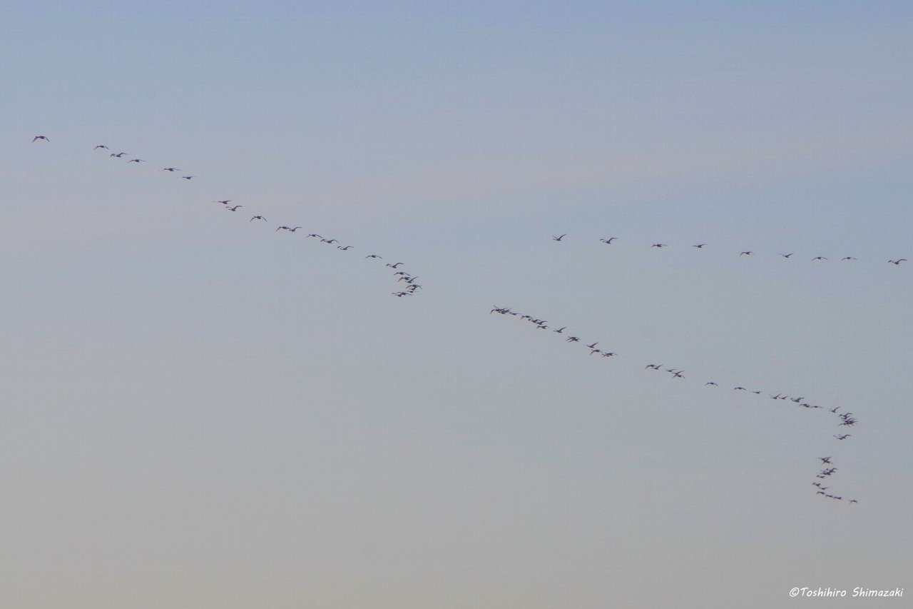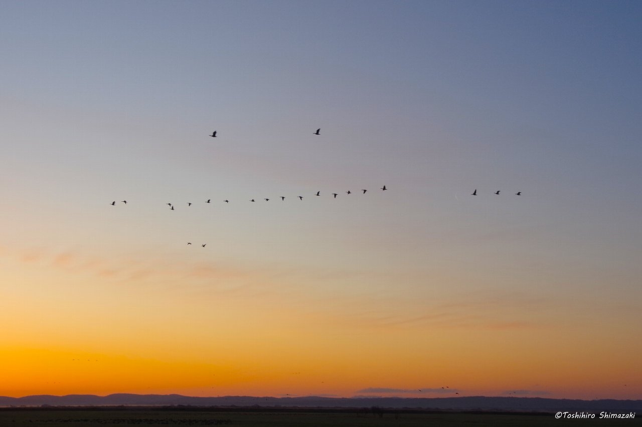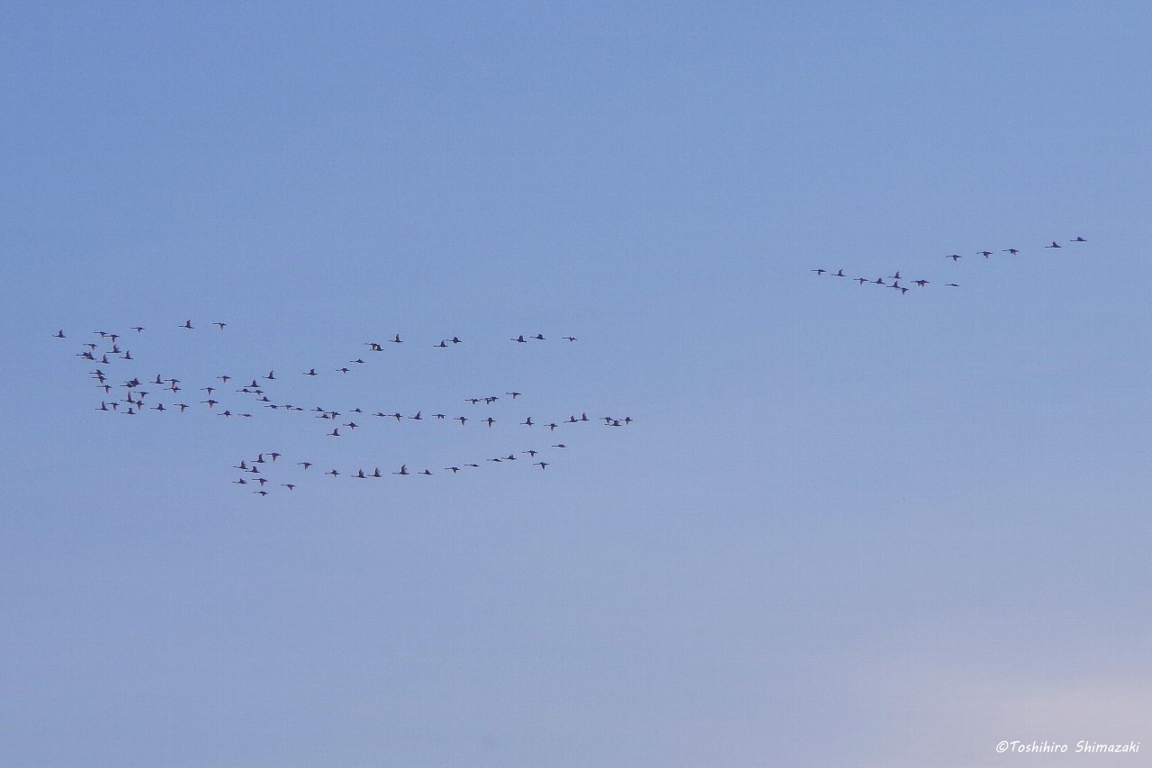 夜明けの空をマガンやハクチョウの群れが飛んで行きました。
