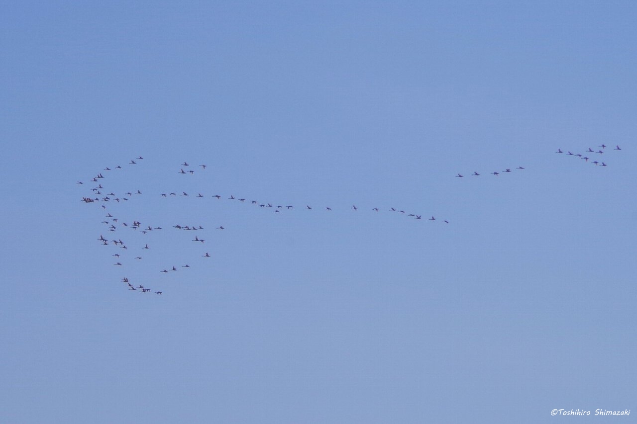 マガンは近くの牧草地への移動なのであまり高くは飛ばず、一方でハクチョウたちは高度を上げて北の空へと渡って行きました。