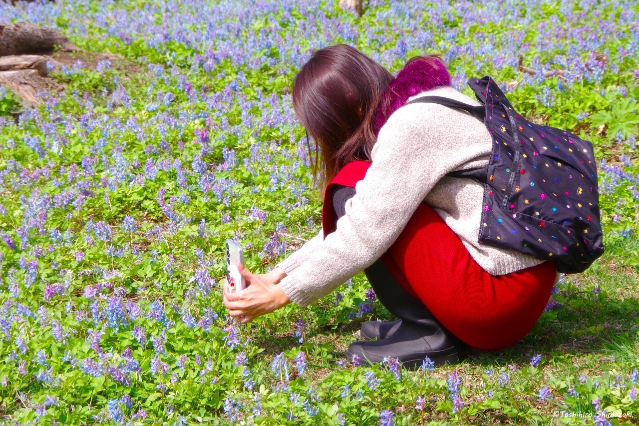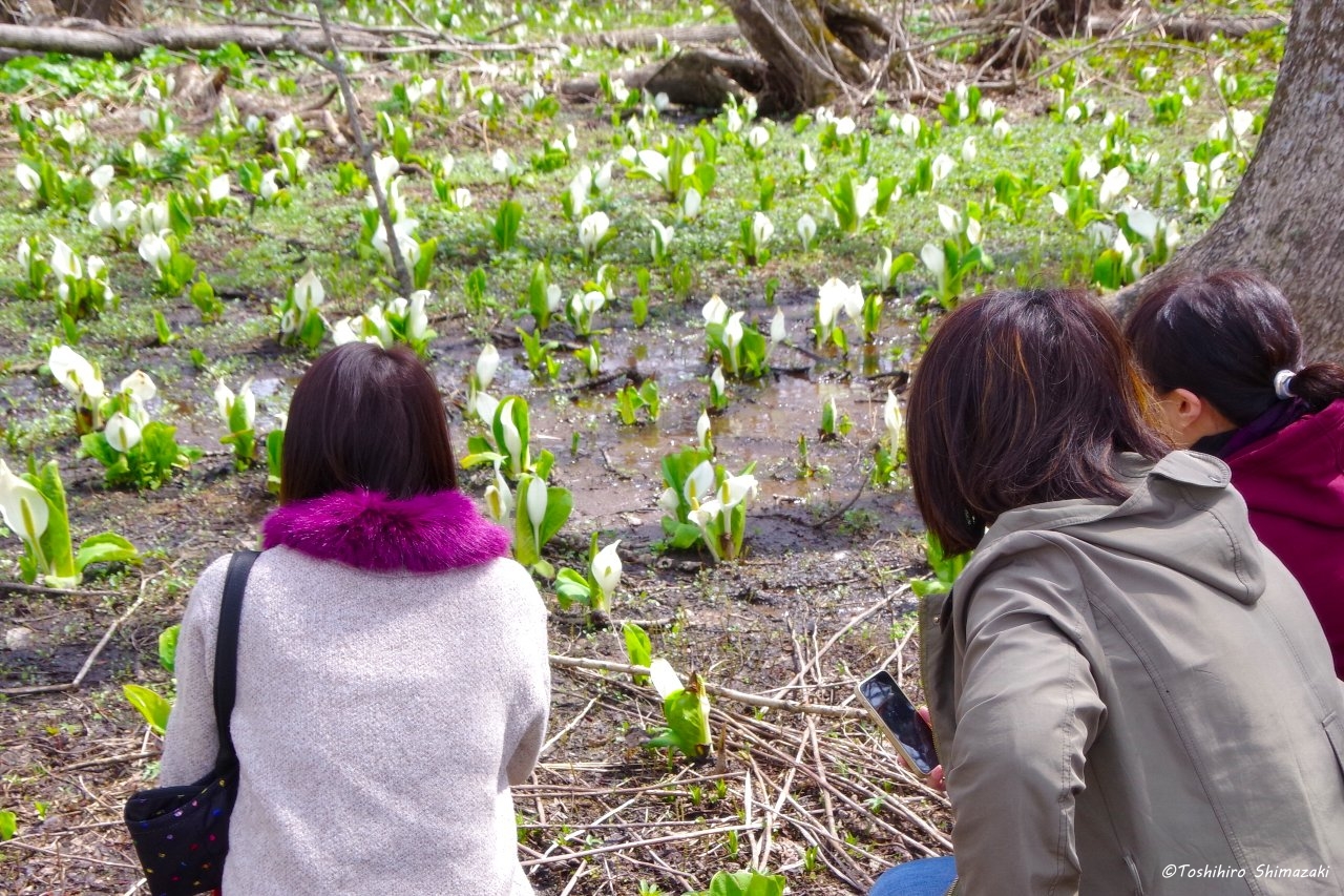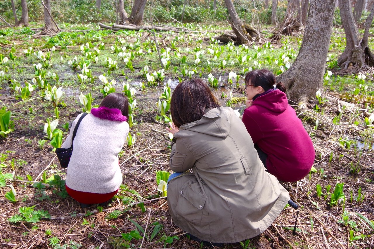 ちょうど満開のミズバショウとエゾエンゴサクの絨毯の両方をお楽しみいただけるとっておきの場所にお連れすると、とても綺麗だと喜んでいただくことができました。